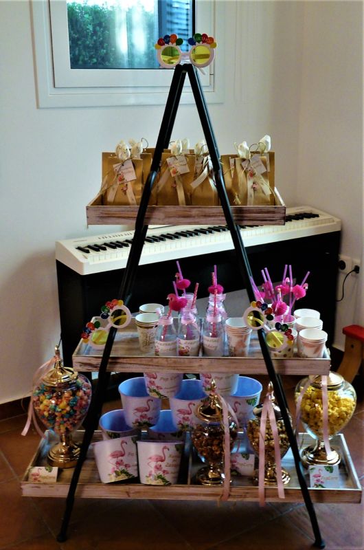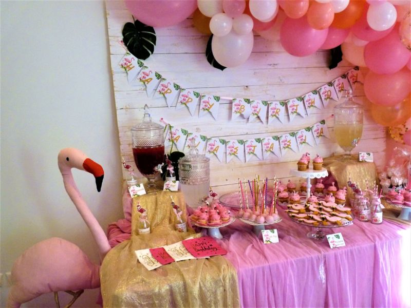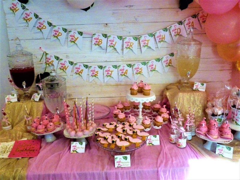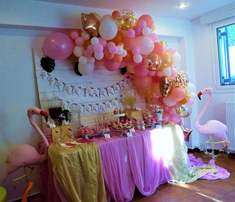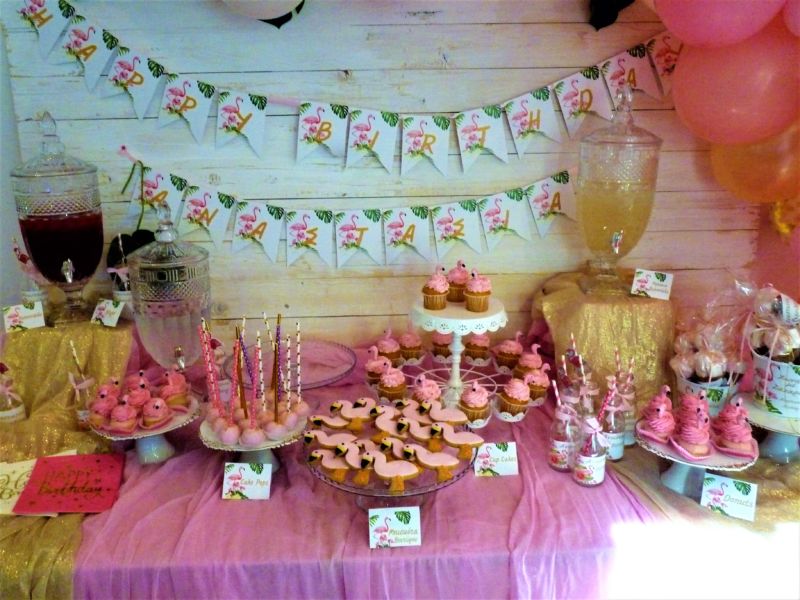Το τραπέζι επάνω είχε γλυκά σε χρώματα του ροζ με χρυσό,με θέμα το φλαμίνγκο.