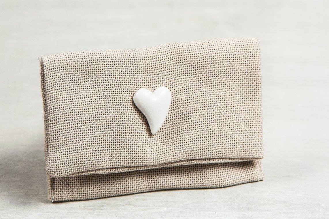 Μπομπονιέρα γάμου Φάκελος υφασμάτινος με εσωτερική επένδυση και διακοσμητική κοκάλινη καρδιά με πέντε κουφέτα αμυγδάλου.