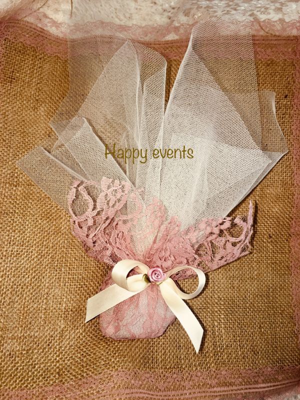 Μπομπονιέρα γάμου από τούλι ύφασμα εκρού χρώμα και δαντέλα σάπιο μήλο διακοσμημένη με φιόγκο από σατέν εκρού κορδέλα και σάπιο μήλο λουλουδάκι.