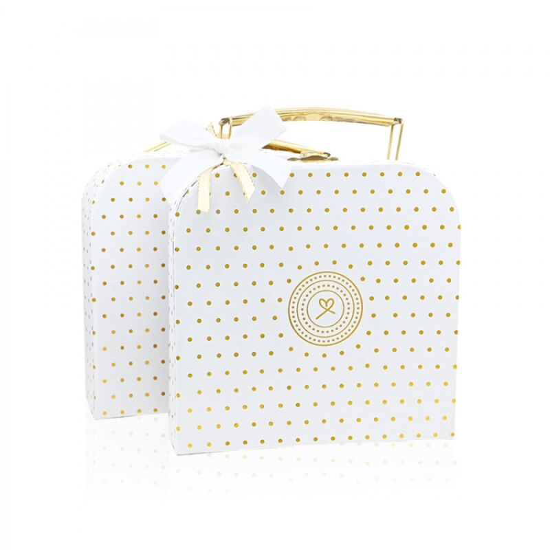 Μπομπονιέρα Βαλιτσάκι λευκό με χρυσά αστεράκια και πουά