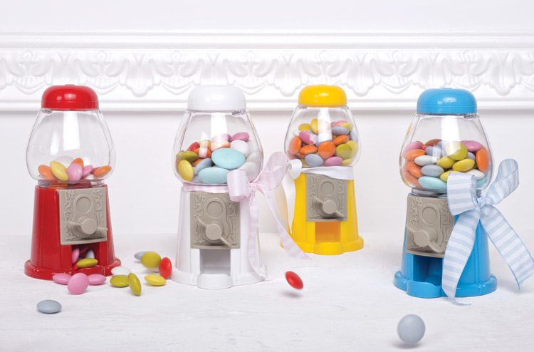 Μπομπονιέρα βάπτισης κουφετομηχανή σε τέσσερα διαφορετικά χρώματα, κίτρινο,κόκκινο,λευκόκαι γαλάζιο