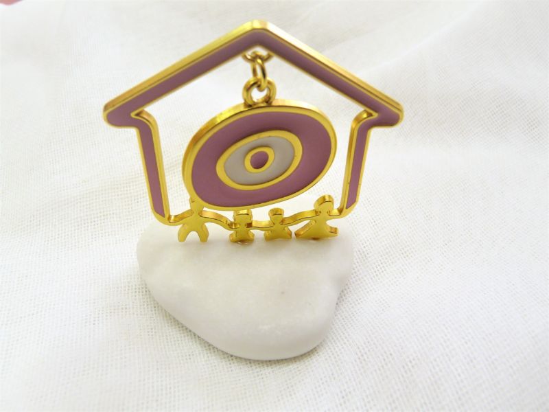 Μπομπονιέρα βάπτισης σπιτάκι χρυσό με μάτι ροζ σε πέτρα.