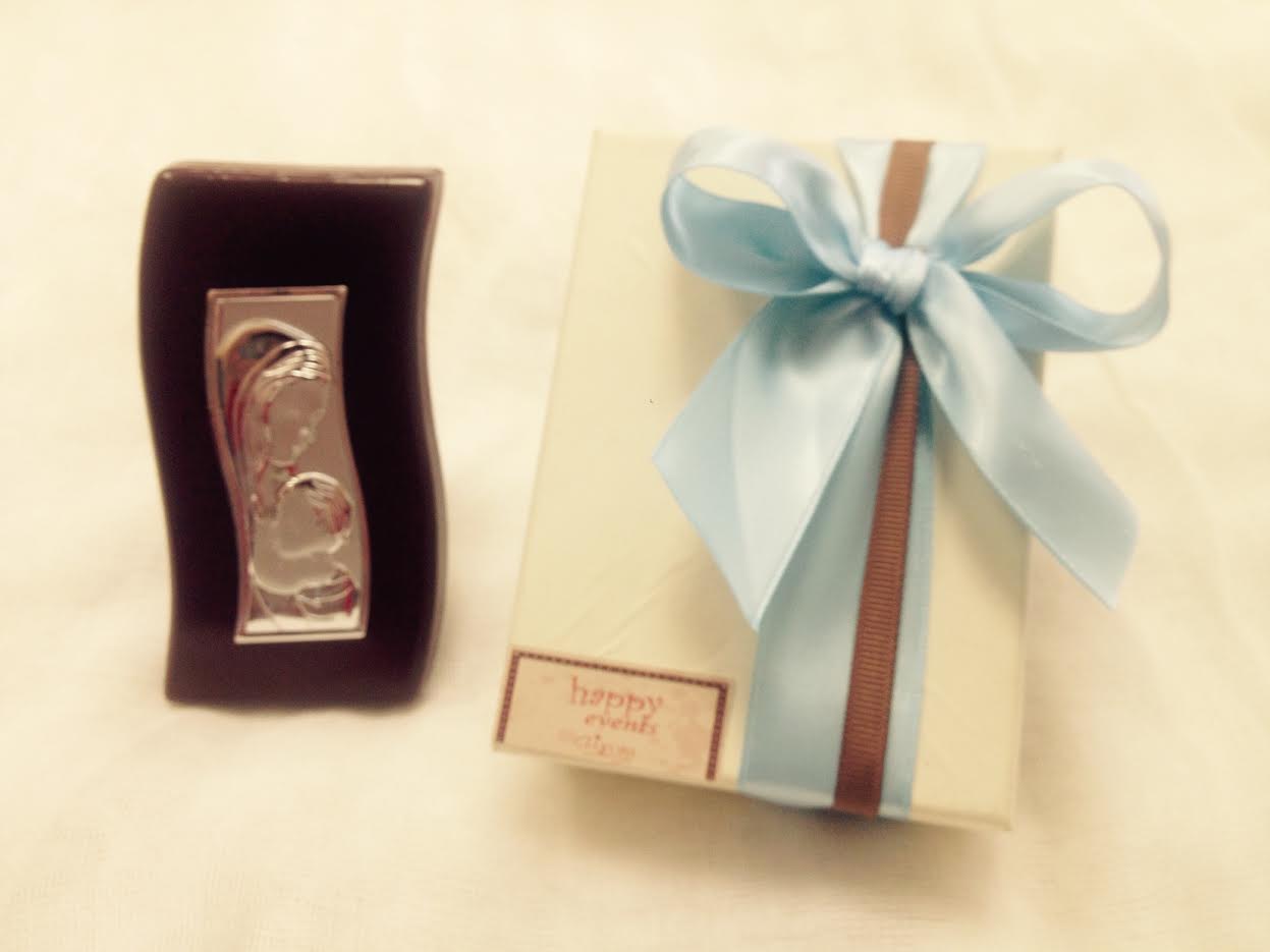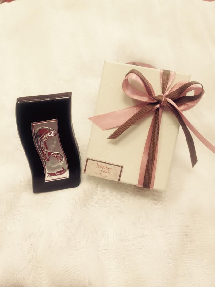 Μπομπονιέρα Επιτραπέζια ξύλινη εικόνα με ασήμι την Παναγία αγκαλιά με τον χριστό με το κουτί της.