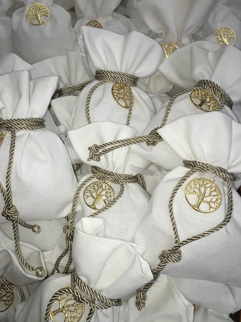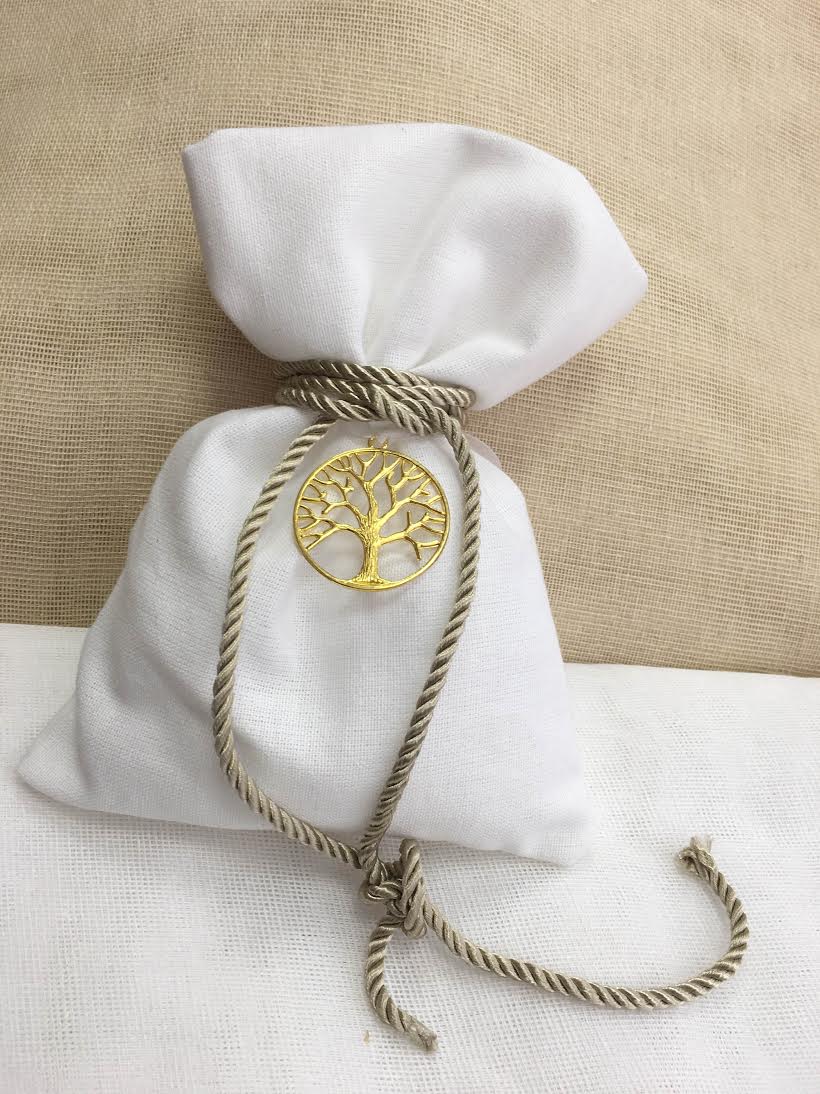 Μπομπονιέρα Γάμου Λευκό Λινό Πουγκί Με Μενταγιόν Δέντρο Ζωής