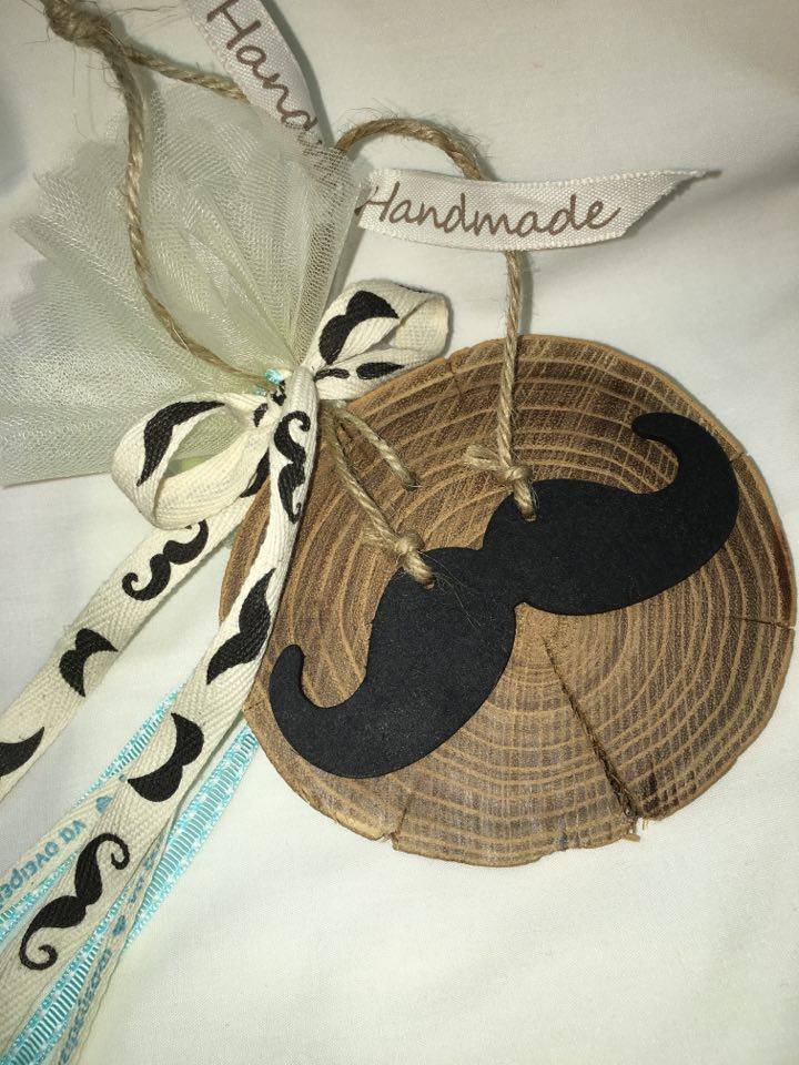 Χειροποίητη μπομπονιέρα Μουστάκι Litle man Σε Φυσικό Κορμό Ξύλου Συνδυασμένη Με Ιδιαίτερες Κορδέλες.