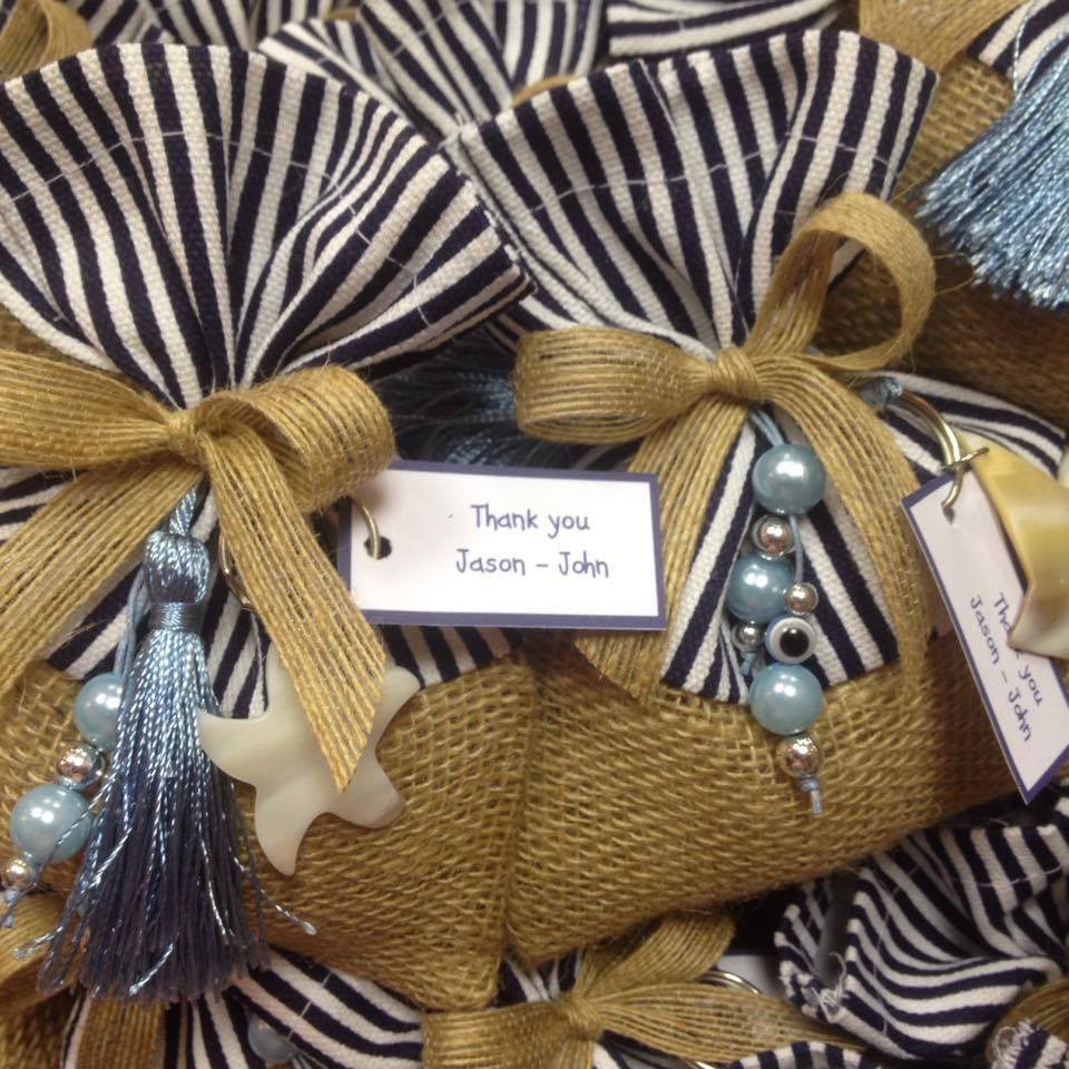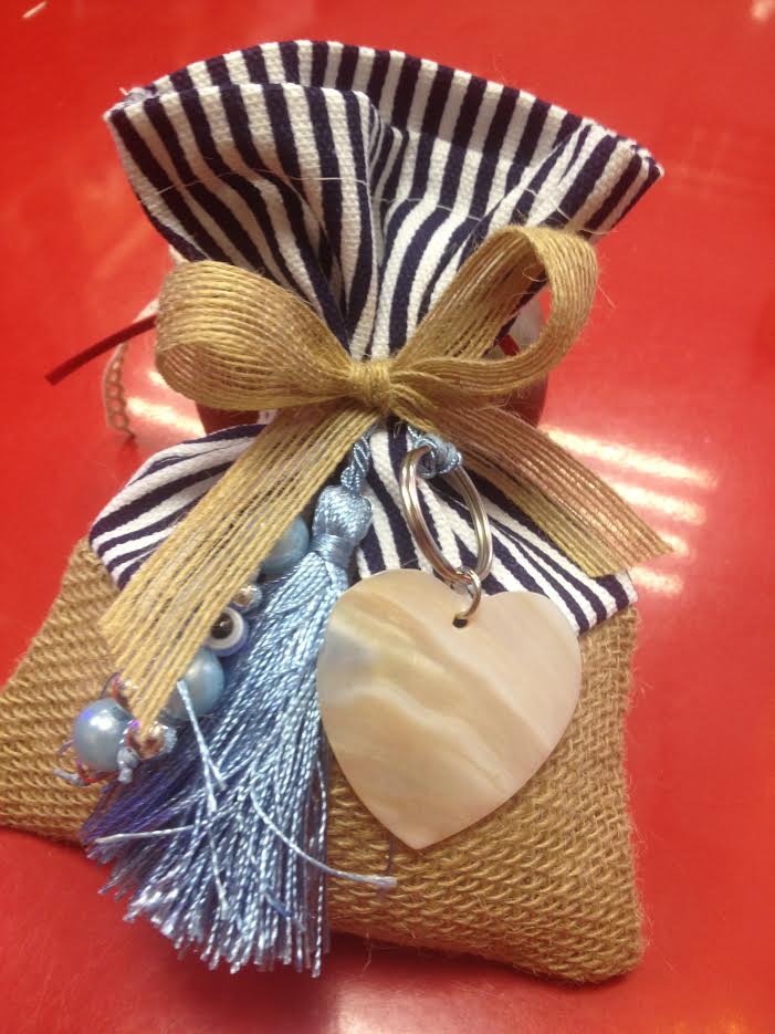 Μπομπονιέρα ριγέ πουγγί καμβάς με λινάτσα με πέντε κουφέτα Crispy η 7 κουφέτα σοκολάτας picolino,