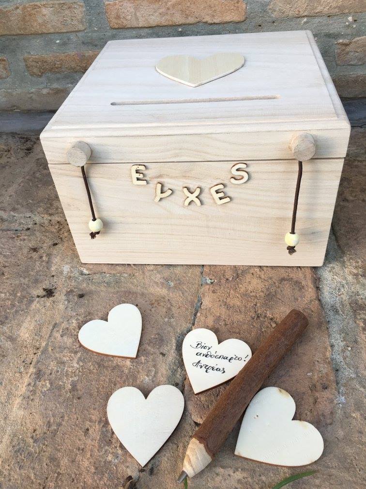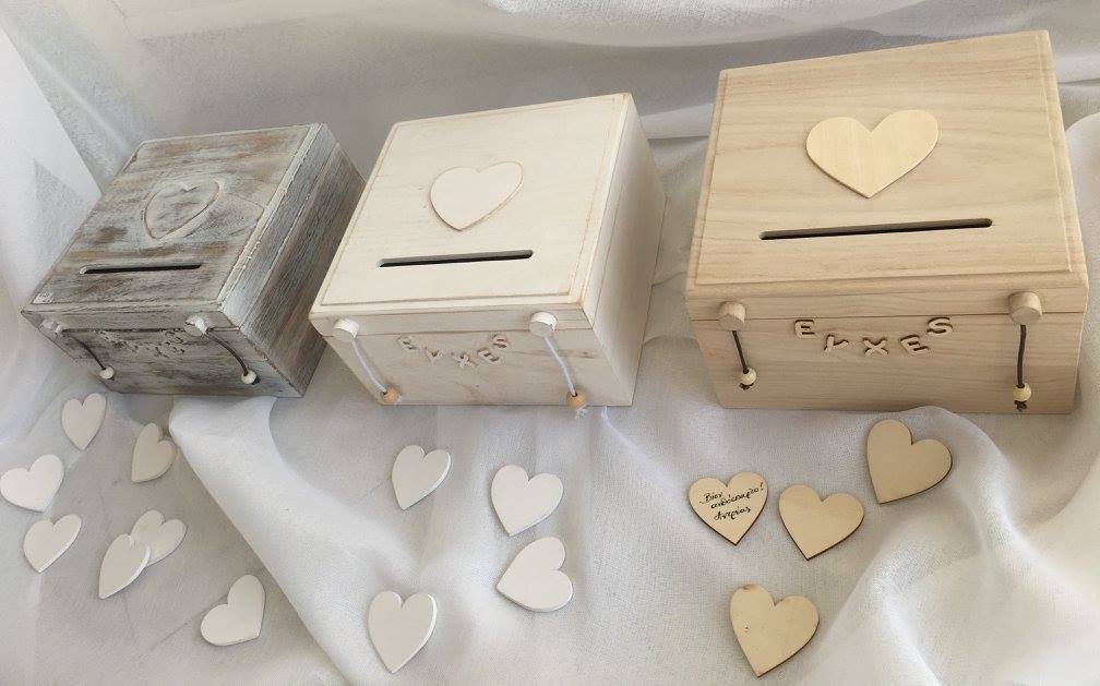 Τα κουτιά είναι σκέτα εάν θέλετε τα συνδυάζετε με ξύλινες καρδούλες όπου επάνω οι καλεσμένοι αφήνουν την ευχή τους