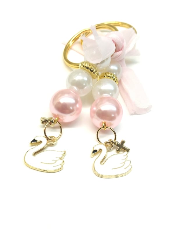 Μπρελόκ κύκνος με ροζ και λευκές χάντρες και χρυσό σταυρό.