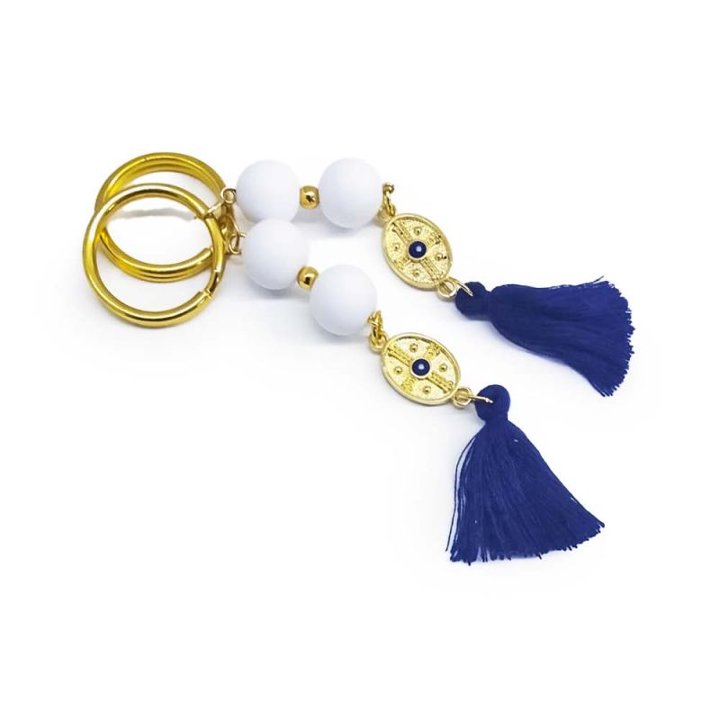 Μαρτυρικό μπρελόκ με λευκές χάντρες, φούντα μπλε, κωνσταντινάτο με σταυρό για την βάπτιση του μωρού σας.