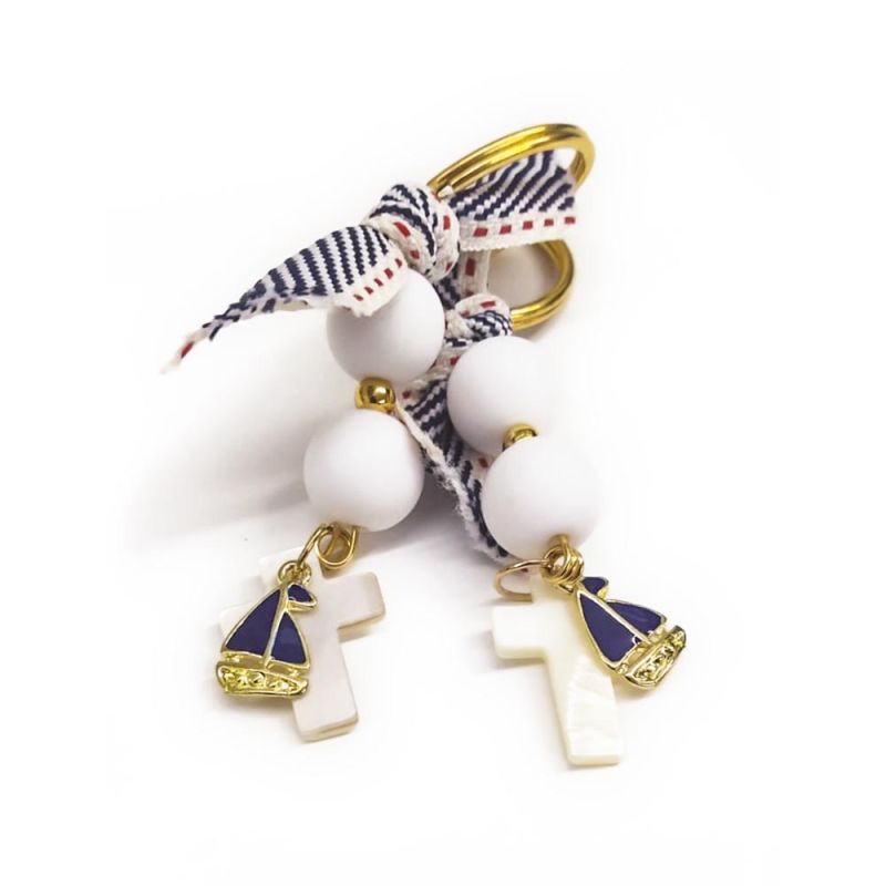 Μπρελόκ με χάντρες λευκές και χρυσές με λευκό σταυρό