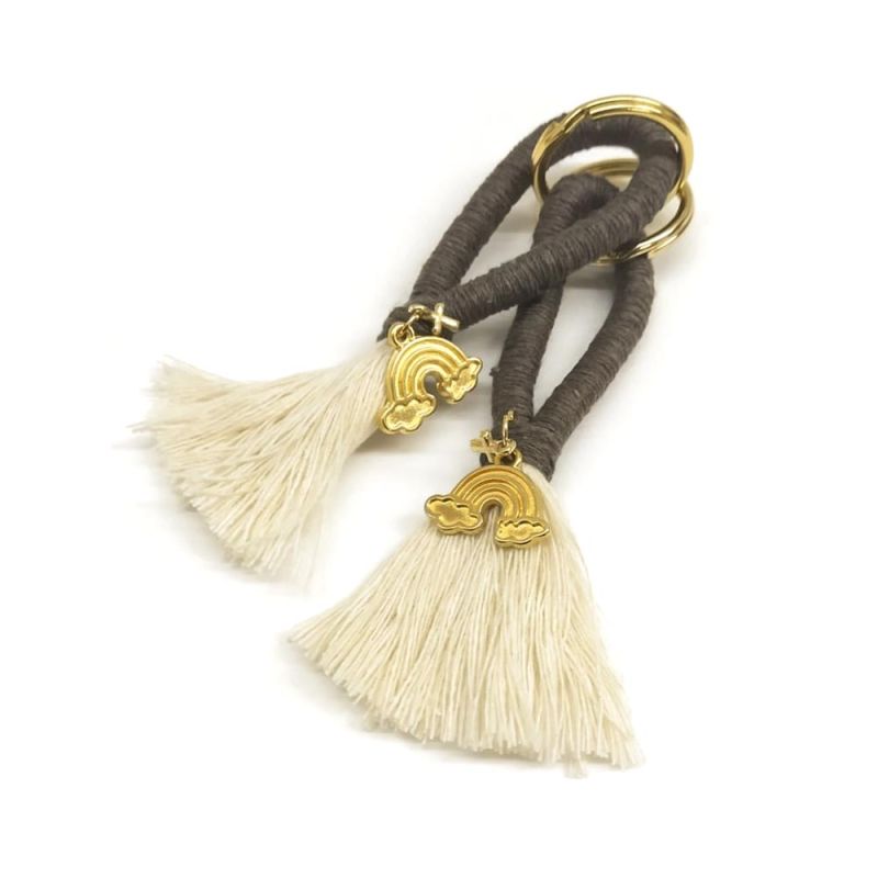 μπρελόκ, μακραμέ καφέ με φούντα εκρού, επίχρυσο ουράνιο τόξο και σταυρό