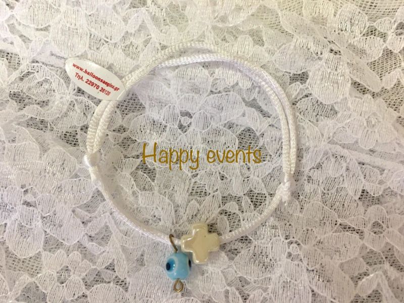 Μαρτυρικά βραχιολάκια για βάπτιση αγόρι και κορίτσι με κορδέλα ποντικοουρά σε λευκό χρώμα, γυάλινο στρογγυλό μάτι και γυάλινο σταυρό,ελάχιστη παραγγελία 50 τεμάχια.
