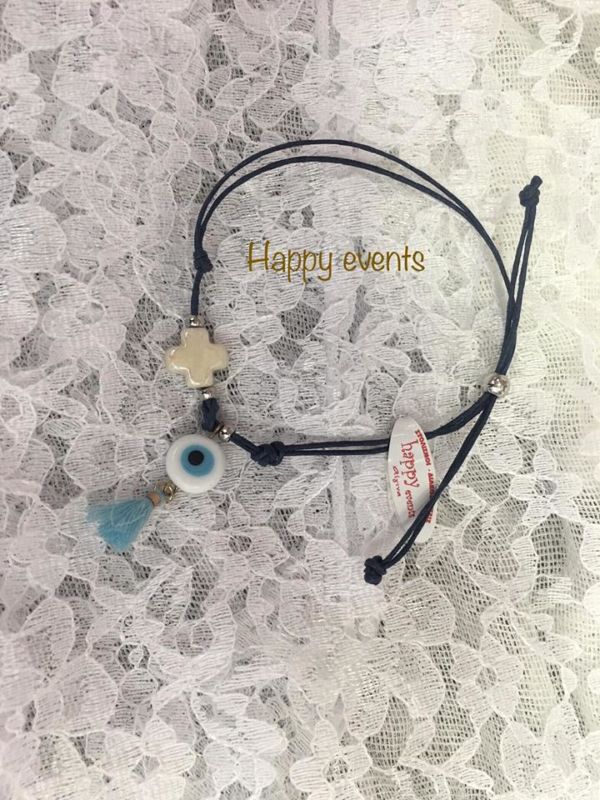 Μαρτυρικά βραχιολάκια με κέρινο κορδόνι, φούντα κεραμικό μάτι και γυάλινο σταυρό,ελάχιστη παραγγελία 20 τεμάχια.