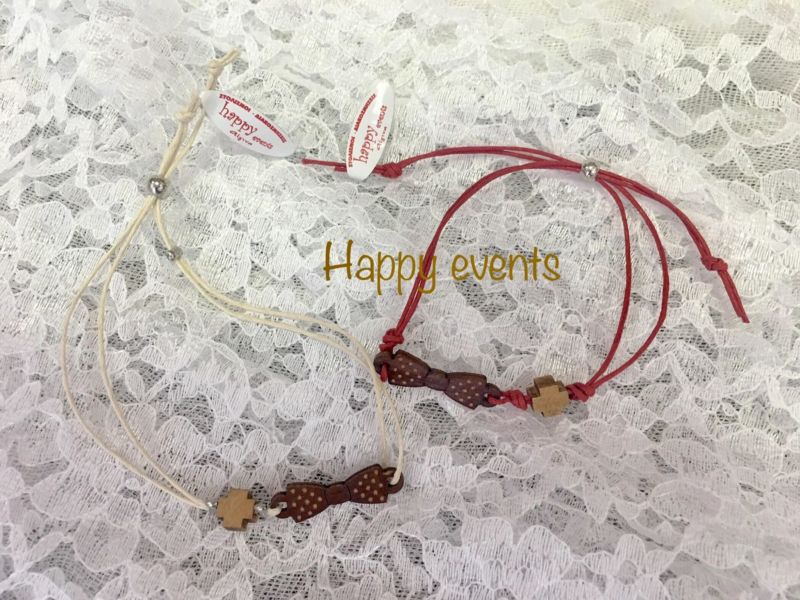 Μαρτυρικά βραχιολάκια μικρός κύριος με κέρινο κορδόνι, ξύλινο σταυρό και ξύλινο διακοσμητικό παπιγιόν πουά και μεταλλικές χάντρες.