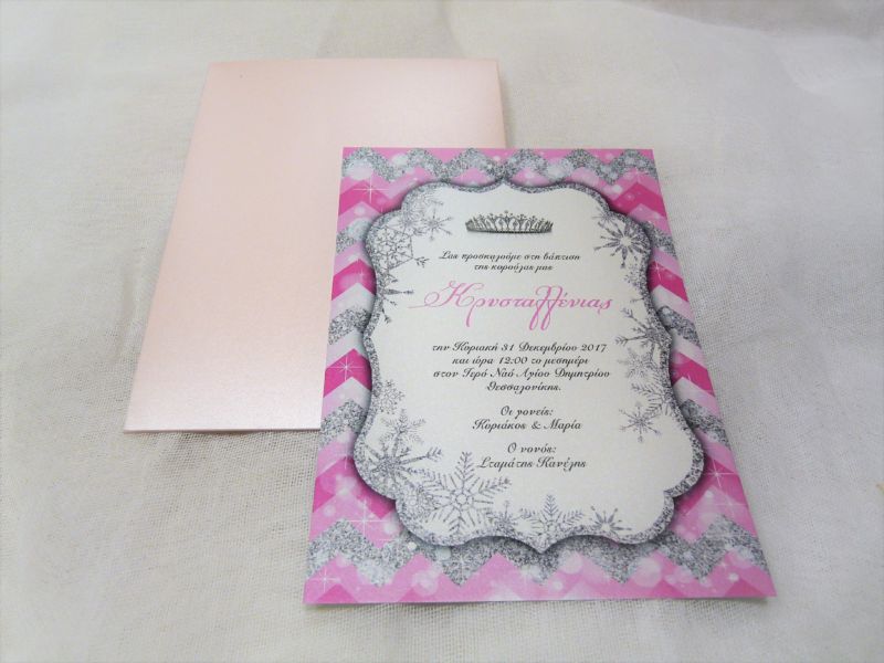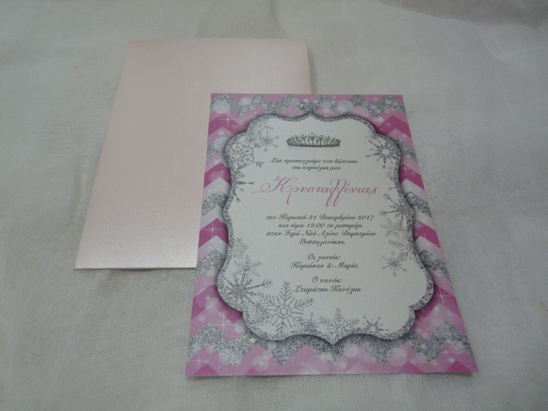 Φάκελος και κάρτα μεταλλικό ροζ χαρτί, με χιονονιφάδες ασημένιες και λευκές μπάλες.