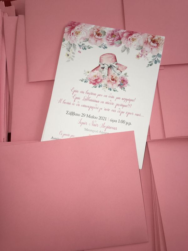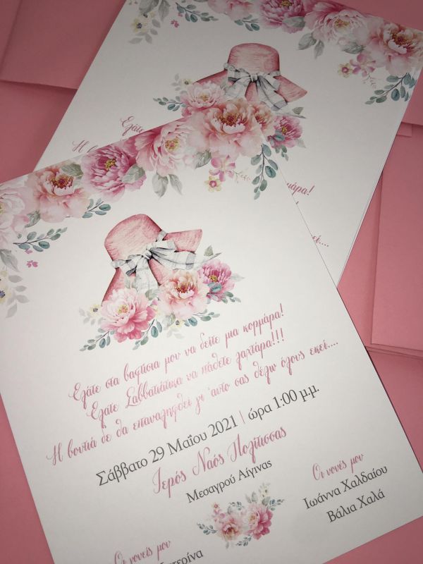 προσκλητήριο βάπτισης κορίτσι καπέλο λουλούδια ρομαντικό