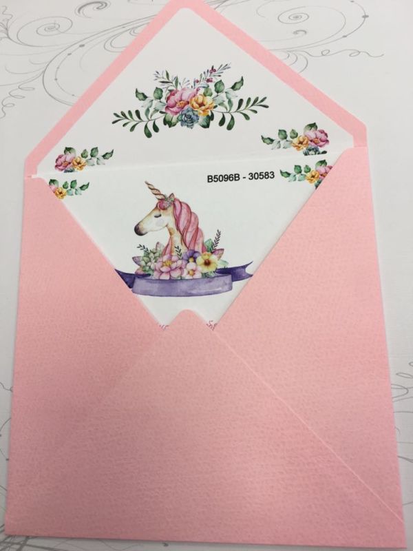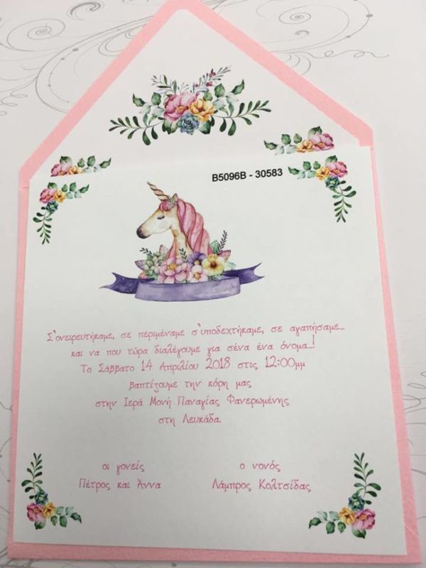 Προσκλητήριο βάπτισης μονόκερος με ροζ φάκελο επενδυμένο με λουλουδάκια.