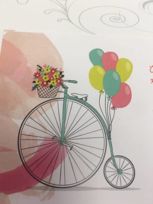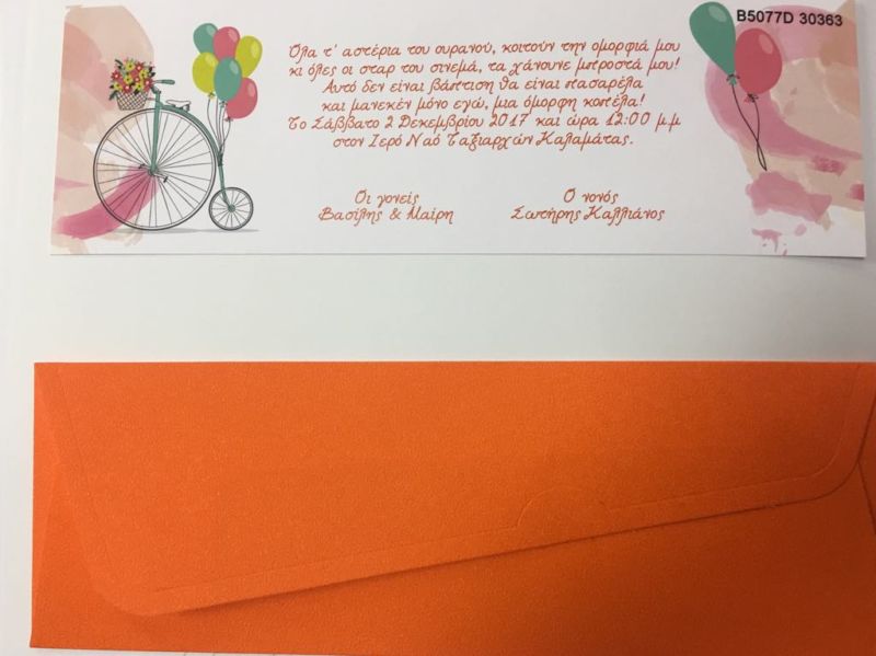 Προσκλητήριο βάπτισης με ποδήλατο,λουλούδια και μπαλόνια