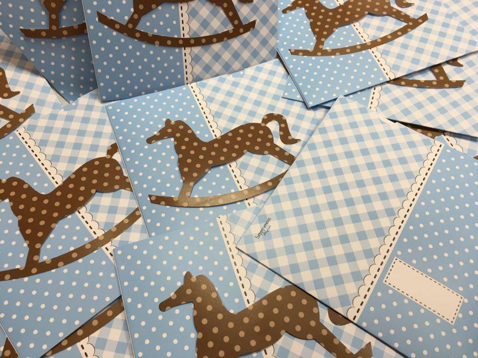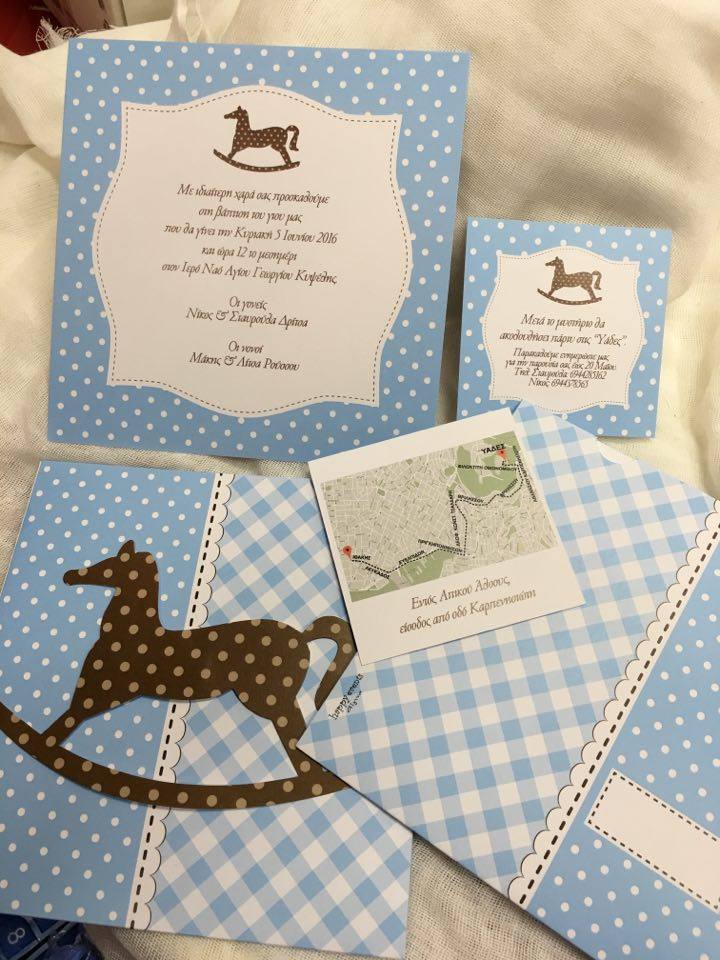 Προσκλητήριο Βάπτισης Τετράγωνο Καρώ Πουά Με κοπτικό Αλογάκι Πάνω Στο Φάκελο.