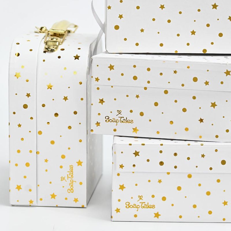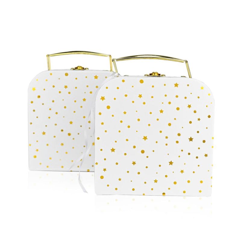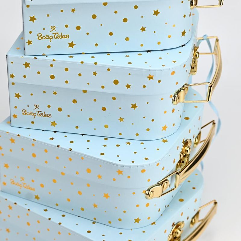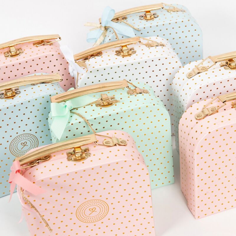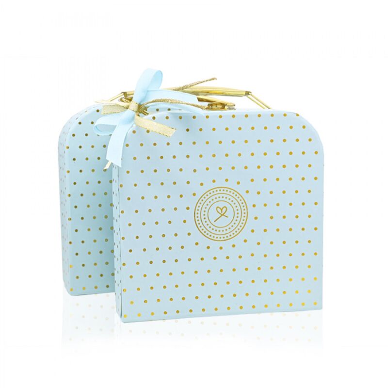 Μπομπονιέρα Βαλιτσάκι σιέλ χρυσό από σκληρό χαρτόνι και μεταλλικό χερούλι με αστεράκια και πουά.