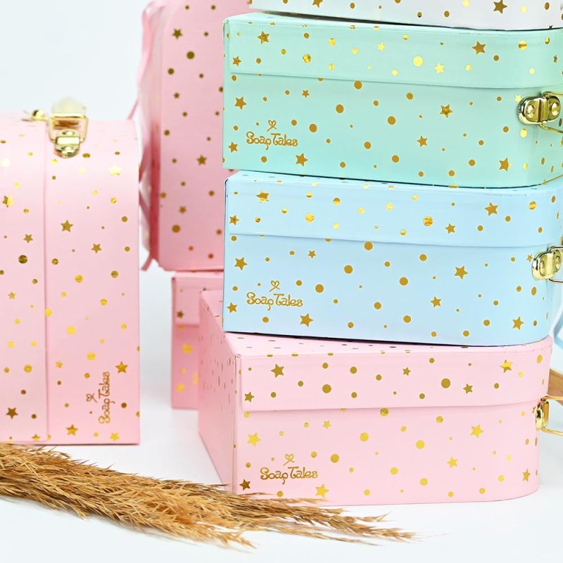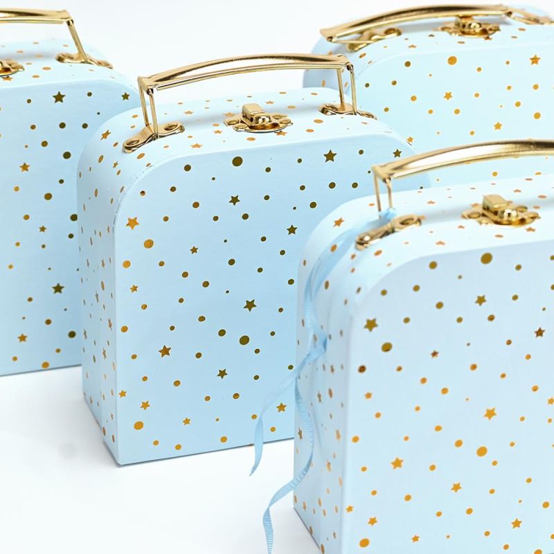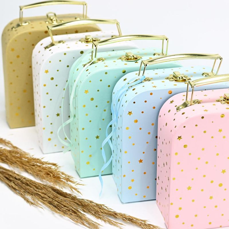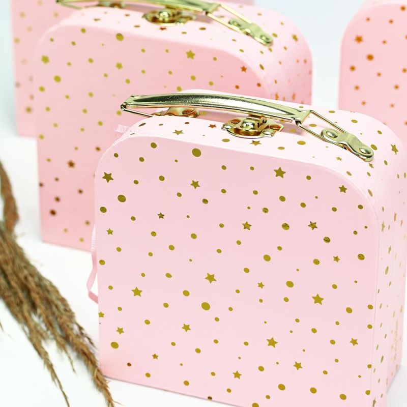 Μπομπονιέρα Βαλιτσάκι ροζ με χρυσά αστεράκια και πουά.
