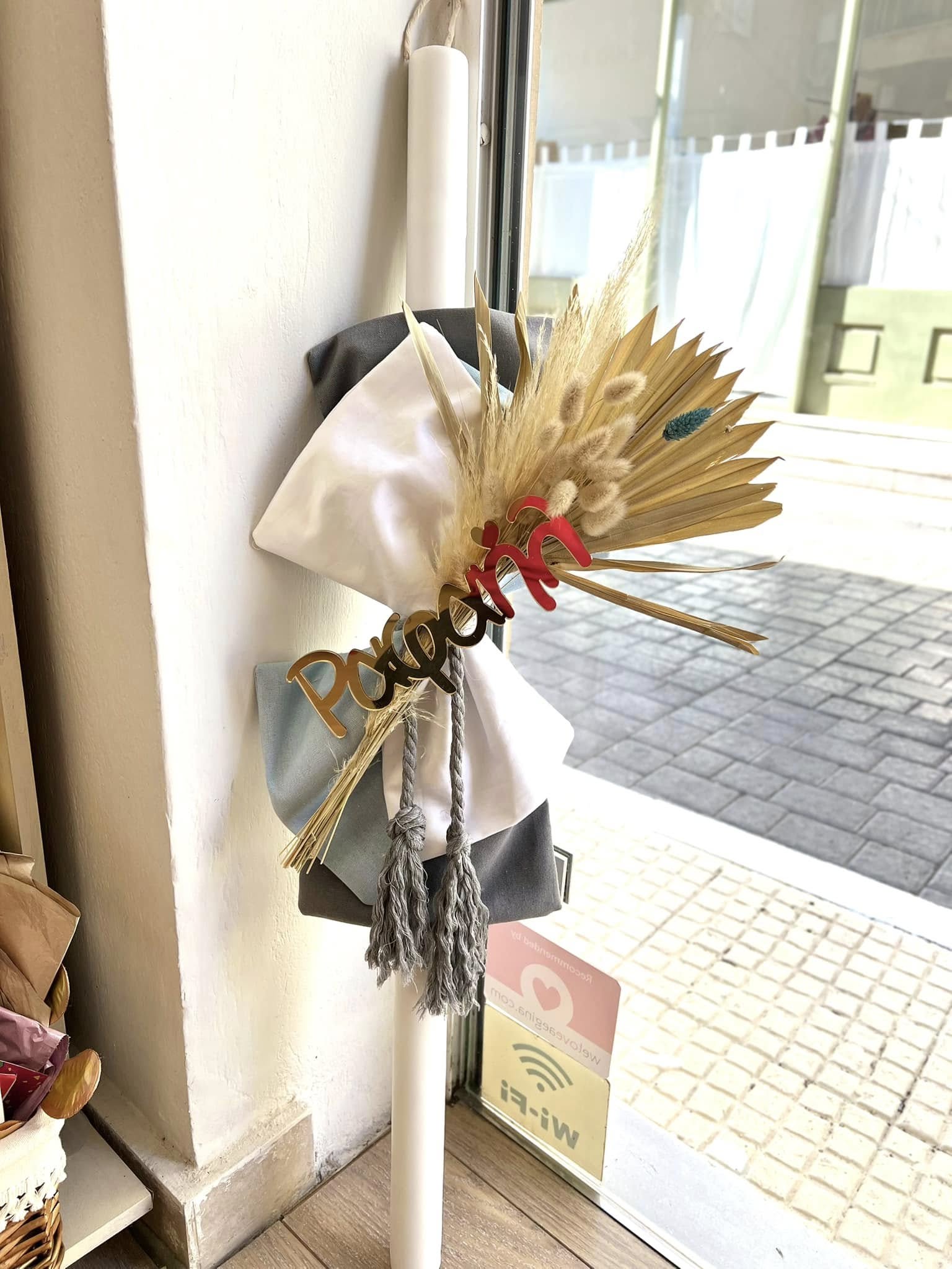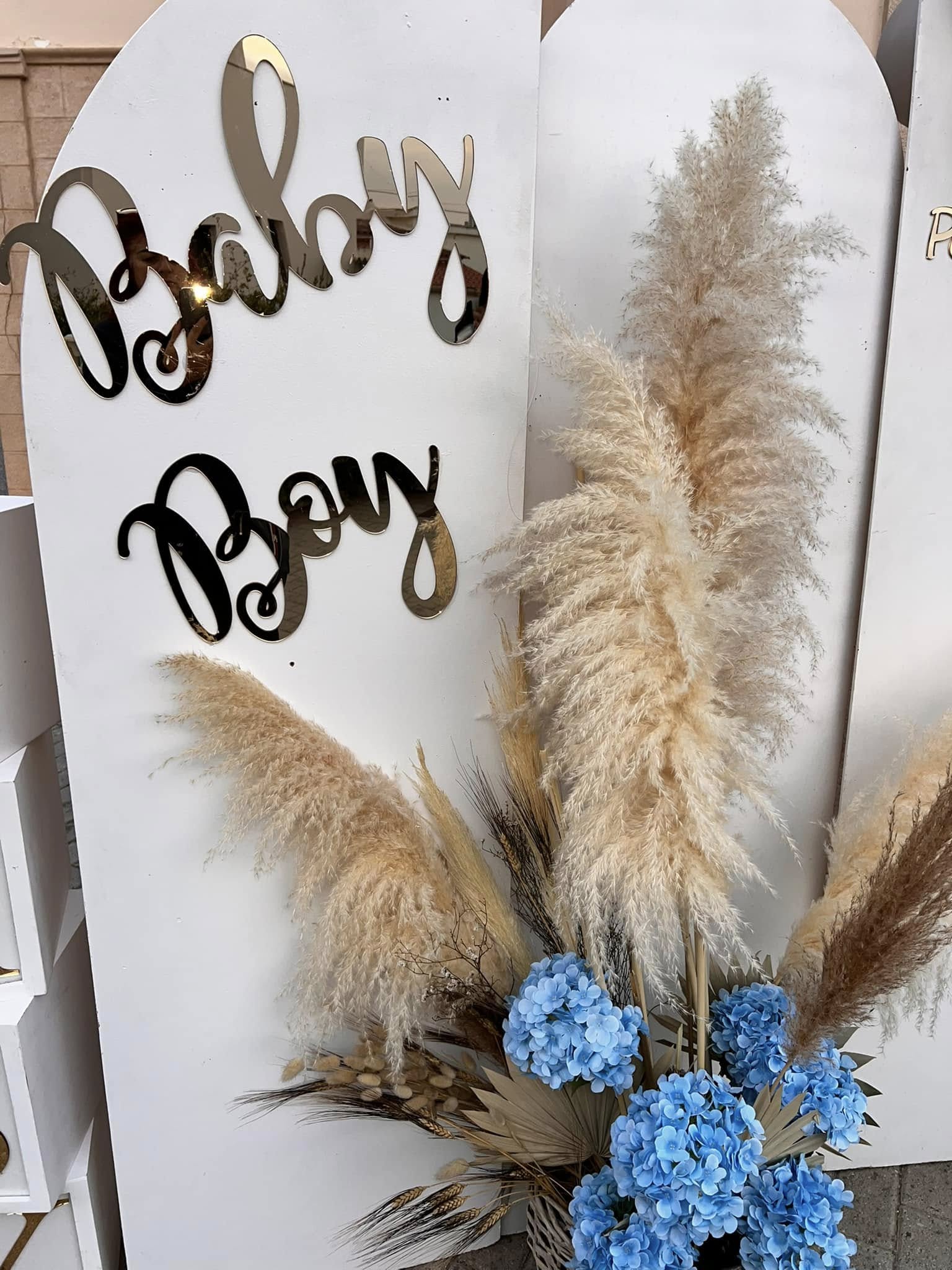 Μεγάλα καλάθια με αποξηραμένα λουλούδια και pampas grass πλαισίωσαν τη διακόσμηση, προσθέτοντας υφές και μια αίσθηση φυσικής αρμονίας