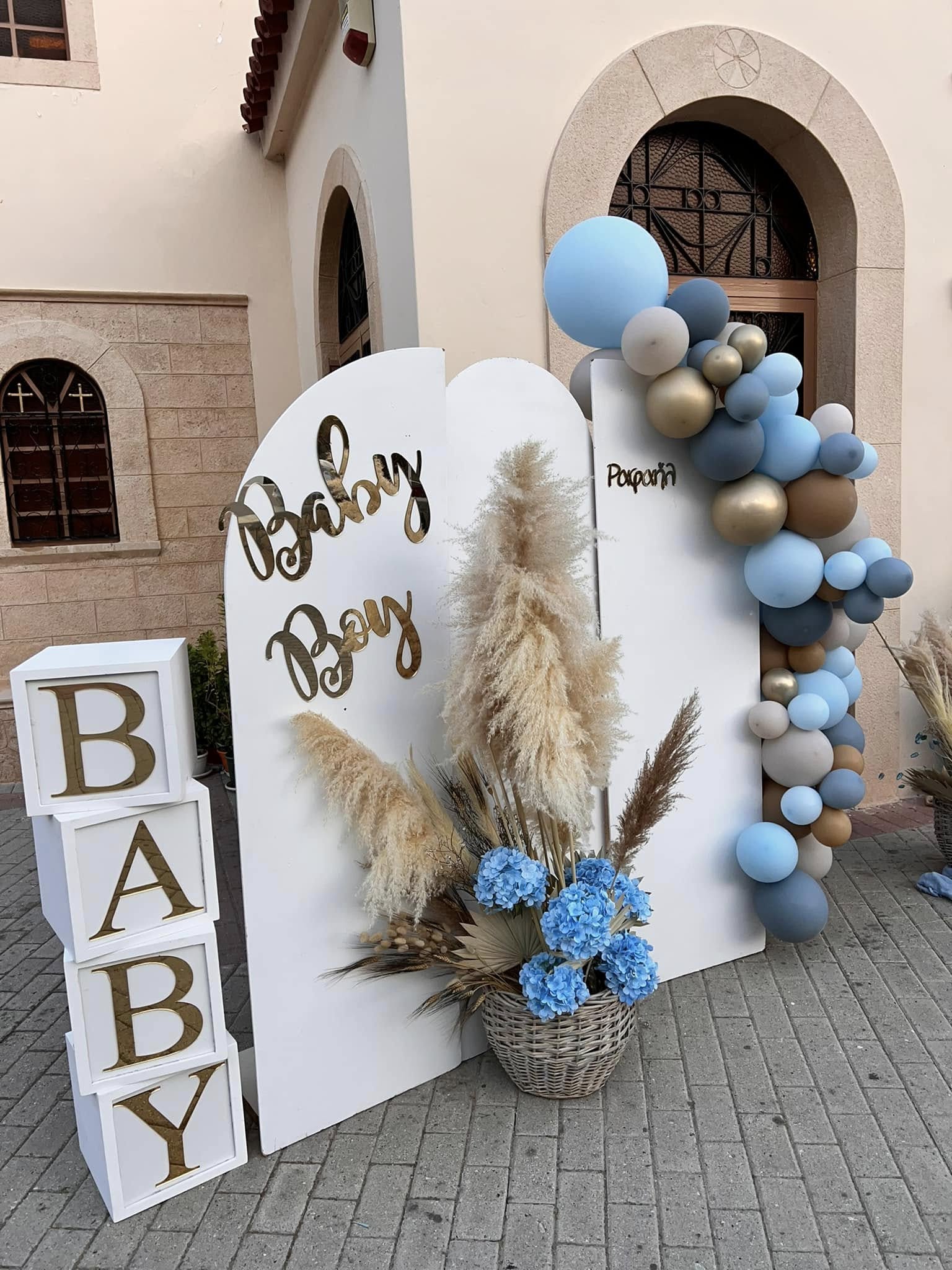 Σε boho ύφος, δημιουργήσαμε έναν ατμοσφαιρικό στολισμό με μπαλόνια σε αποχρώσεις dusty blue και λευκού, που χάριζαν φρεσκάδα και ηρεμία στον χώρο