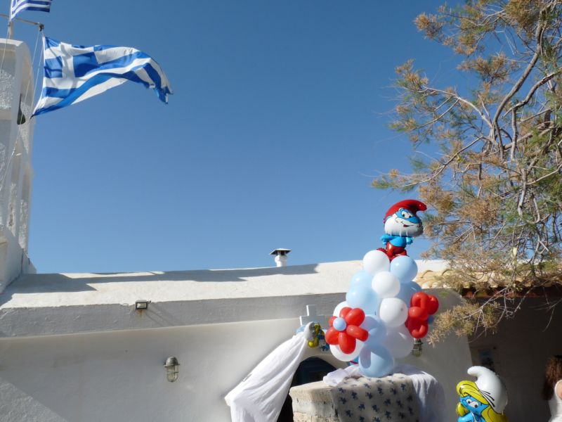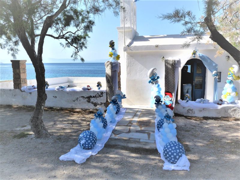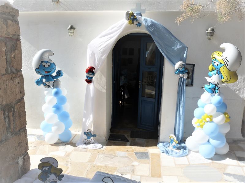 Διακοσμήσαμε την είσοδο με μπαλόνια κατασκευές στρουμφάκια ,ρυζόμπαλες πουά μπλε τοποθετημένες πάνω σε λευκές γάζες,