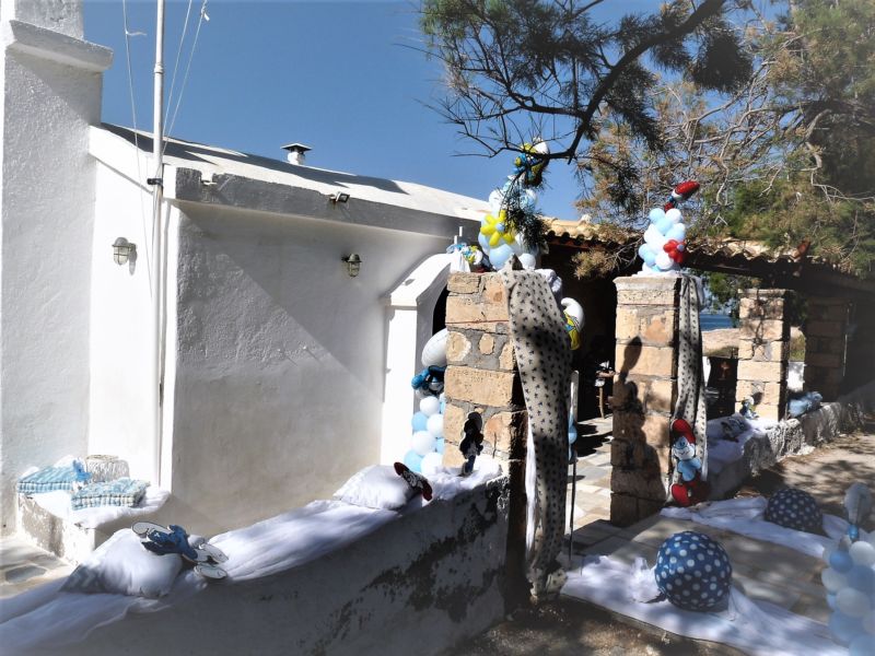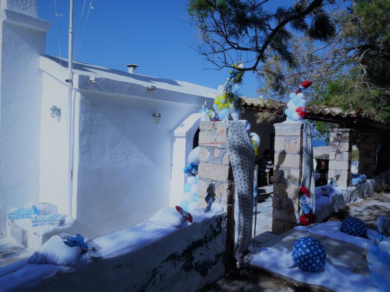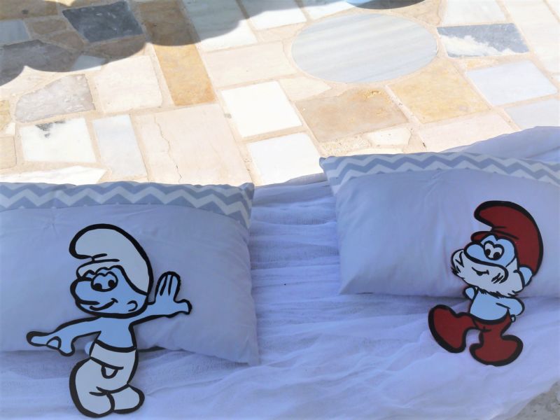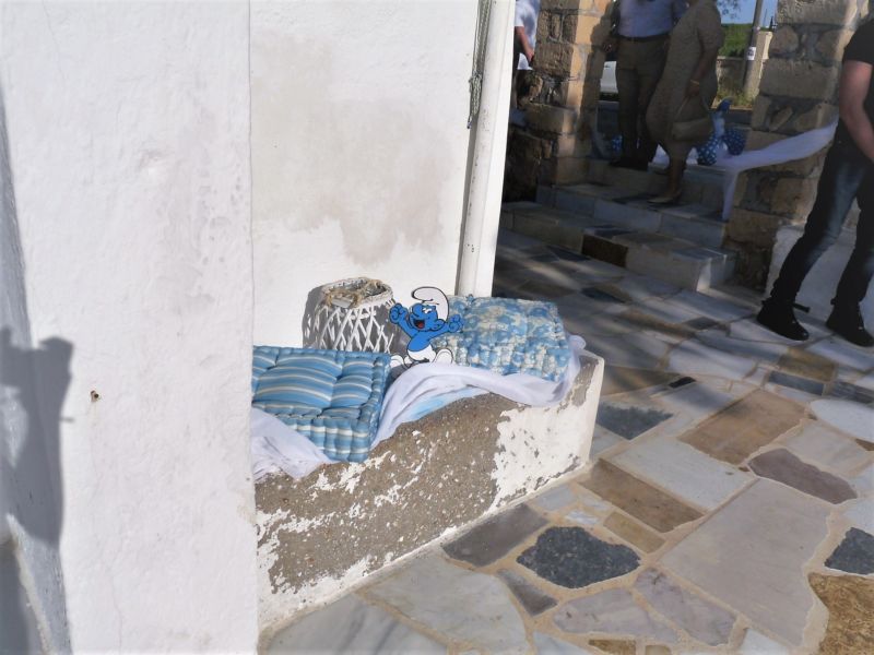 στολίσαμε τα λευκά πεζούλια με λευκές γάζες, χειροποίητα μαξιλάρια και στρουμφάκια από ξύλο.