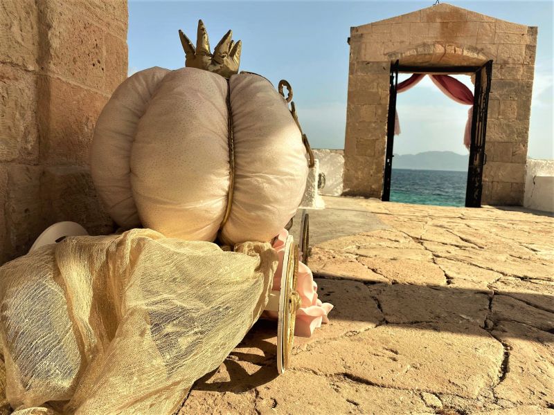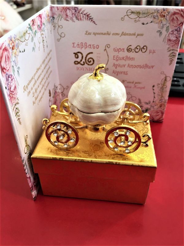Όλοι οι συγγενείς και φίλοι που παρευρέθηκαν στην βάπτιση πήραν μια υπέροχη- ιδιαίτερη, σε χρυσό χρώμα μπιζουτιέρα άμαξα, με μια κολοκύθα από πορσελάνη