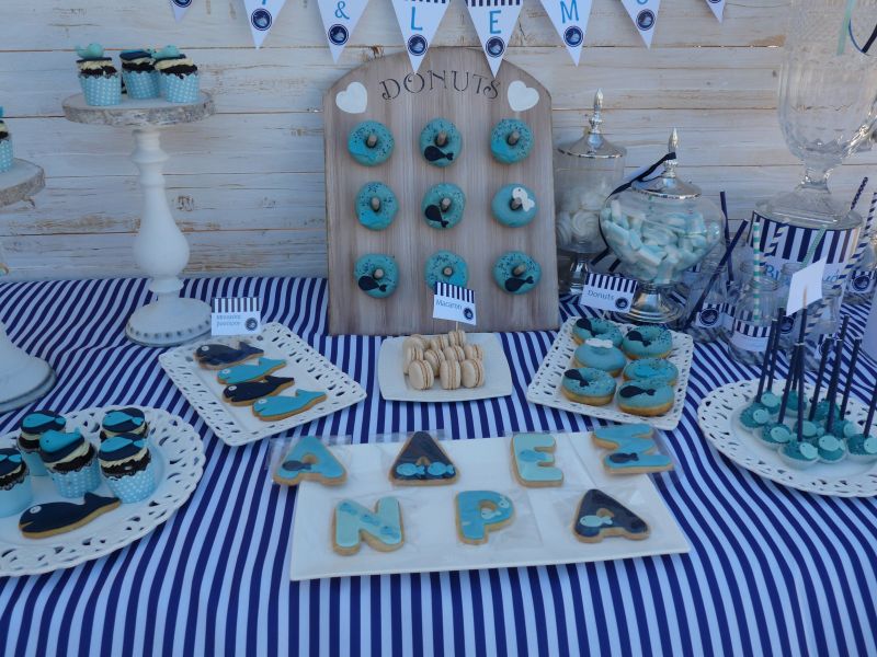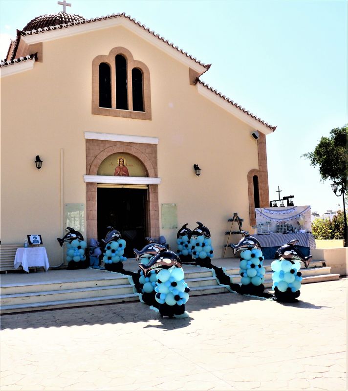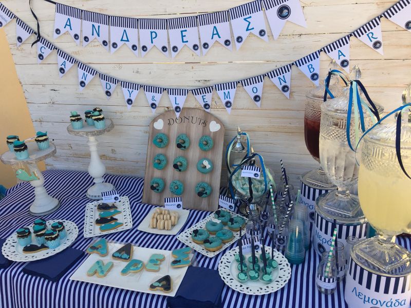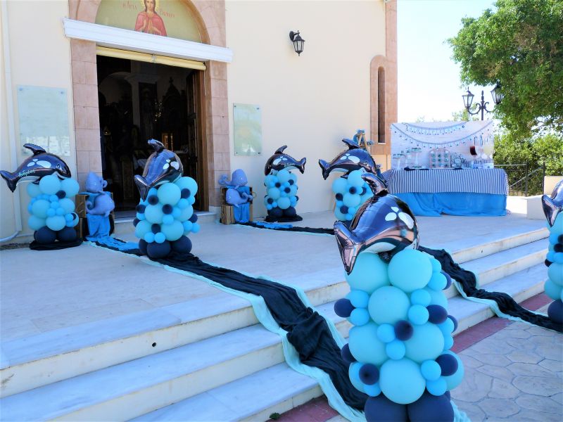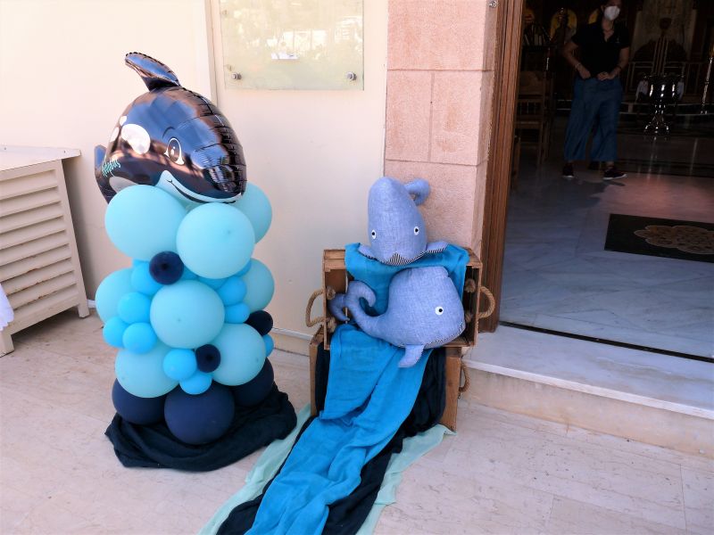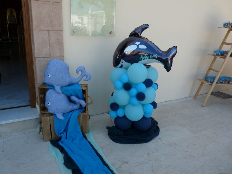 Ένα ιδιαίτερο στολισμό με υφάσματα, στο χρώμα του blue navy τιρκουάζ και βεραμάν, κατασκευές με μπαλόνια και χειροποίητα, υφασμάτινα φαλαινάκια, τα οποία έκλεψαν τις εντυπώσεις και ο μικρός Ανδρέας έπαιξε πολύ μαζί τους!