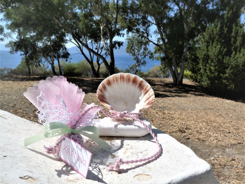 Τα χρώματα που προτείναμε,ήταν της μέντας σε αντίθεση με το πολύ κοριτσίστικο ροζ με πινελιές του μπλε τιρκουάζ, της θάλασσας. Η μπομπονιέρα λευκή αχιβάδα πάνω σε πέτρα.