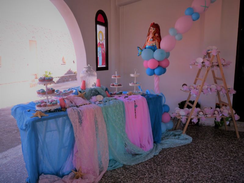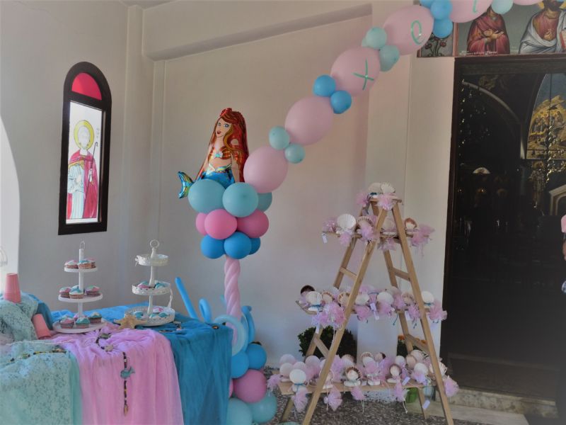 Ο στολισμός θαλασσινός,νησιώτικος με αχιβάδες,κοχύλια,γοργόνες,αστερίες,Δε θα μπορούσαν να λείπουν τα μπαλόνια.Δημιουργήσαμε δύο κατασκευές με γοργόνες που τις ένωνε μια πολύ όμορφη αψίδα που πάνω γράψαμε το όνομα του παιδιού. Το candy bar στόλιζαν τα cupcakes με σχέδιο την ουρά της γοργόνας στα χρώματα της βάπτισης.