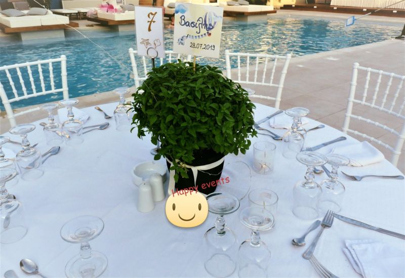Στολισμός τραπεζιών: Στο κέντρο κάθε τραπεζιού τοποθετήσαμε συνθέσεις με βασιλικούς στικ με το όνομα του νεοφώτιστου και μεγάλα διάφανα μπαλόνια με μπλε Led.