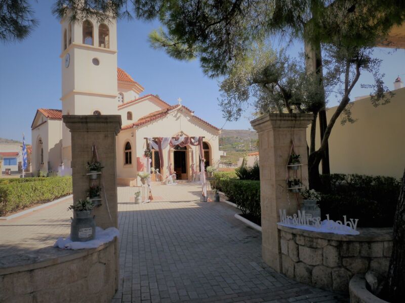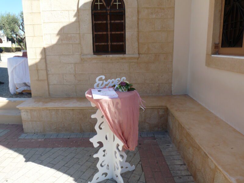 Σε λευκές και σάπιου μήλου αποχρώσεις, ήταν ο χώρος διακοσμημένος με πολλά όμορφα μπουκέτα λουλουδιών που έδιναν ζωντάνια και χρώμα στο χώρο, αρμονικά συνδυασμένα με τα υφάσματα, κασπώ, φανάρια και άλλα διακοσμητικά στοιχεία..