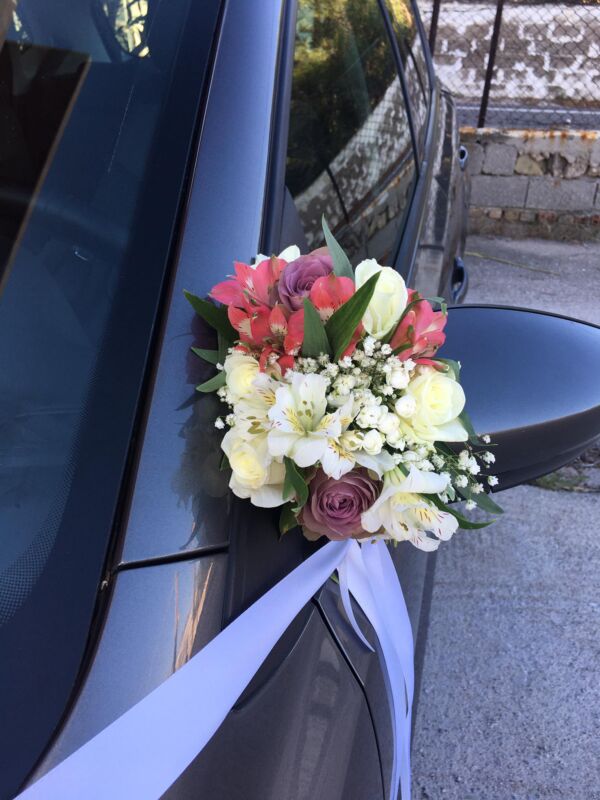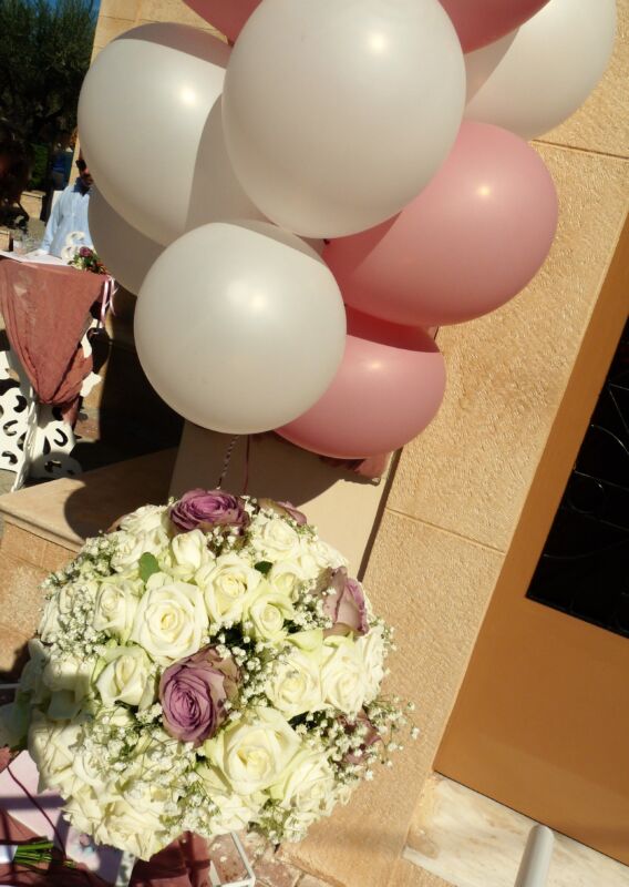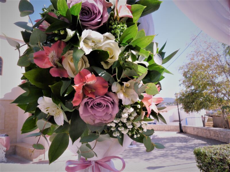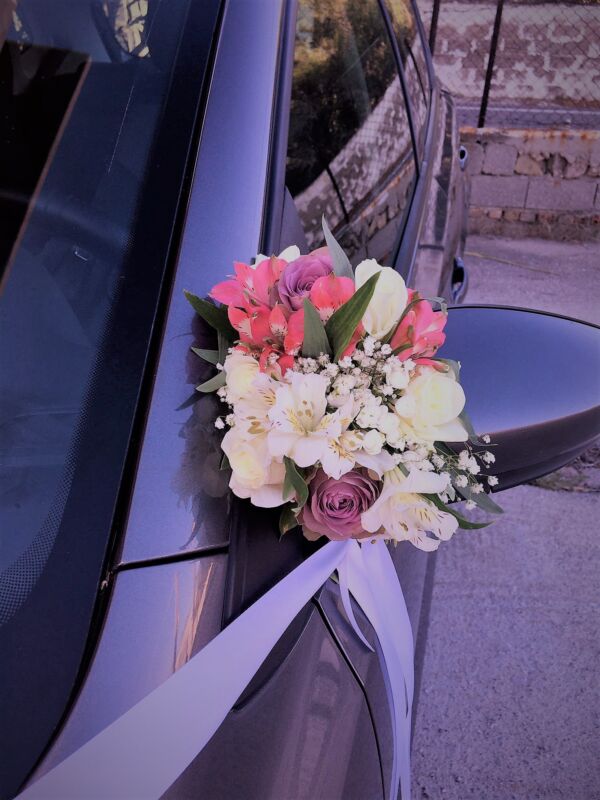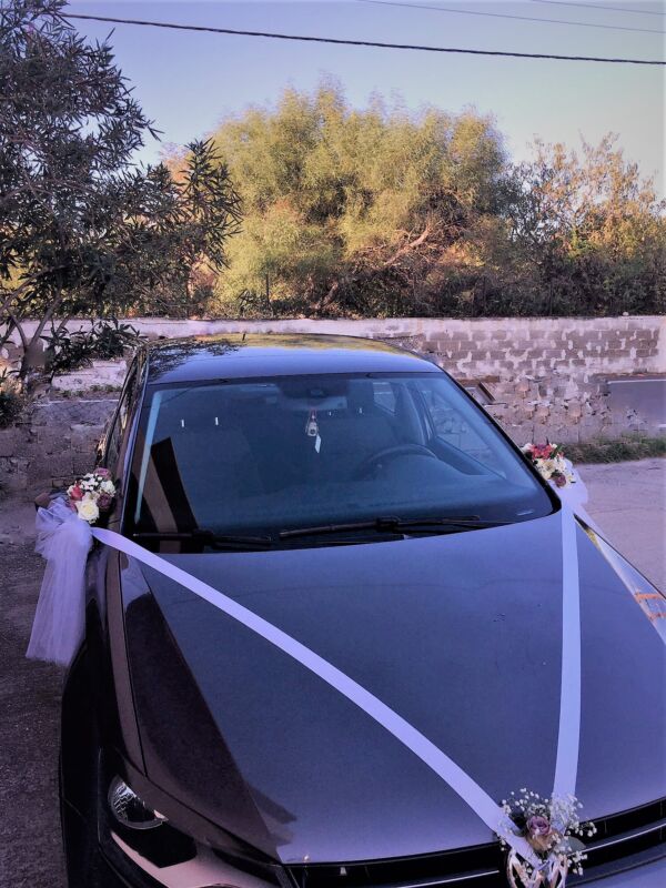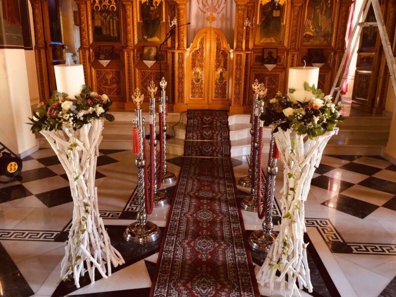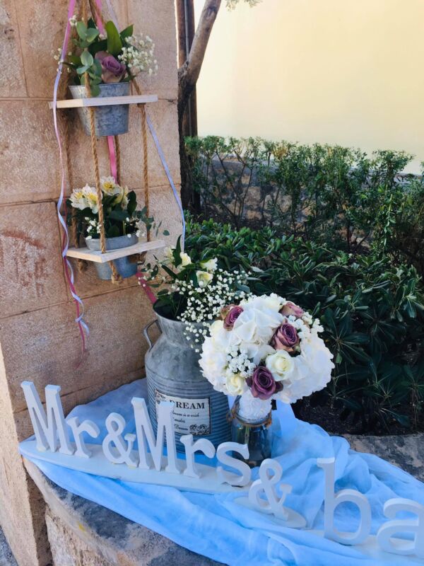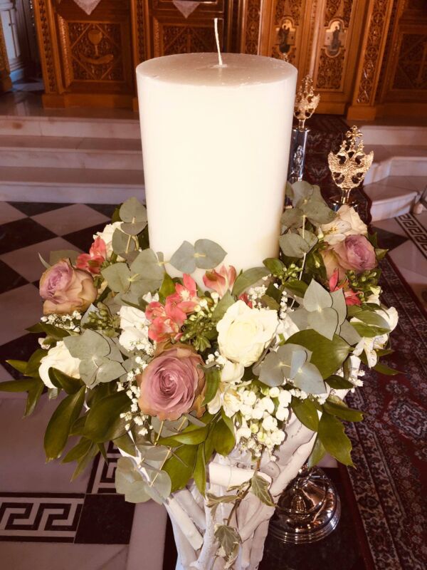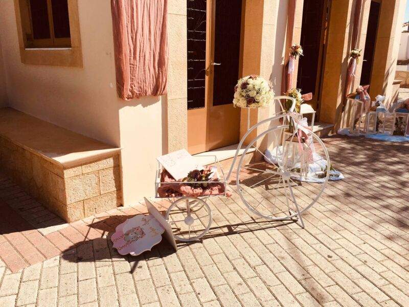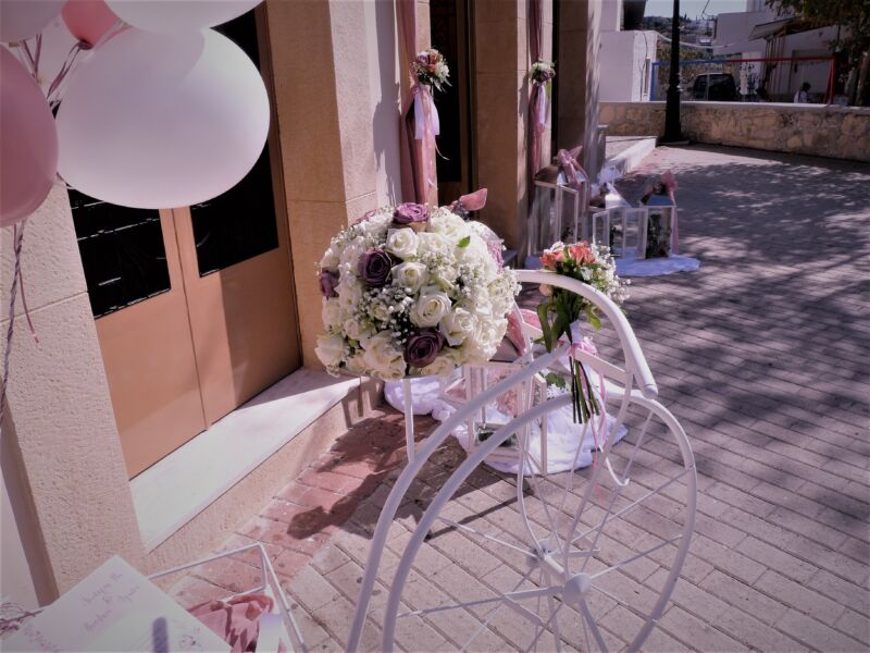 Στο ίδιο ύφος και τα μπουκέτα που στόλισαν το νυφικό αυτοκίνητο, την άμαξα την είσοδο της εκκλησίας, το ποδήλατο, την κούνια καθώς και οι συνθέσεις για τις λαμπάδες του γάμου.