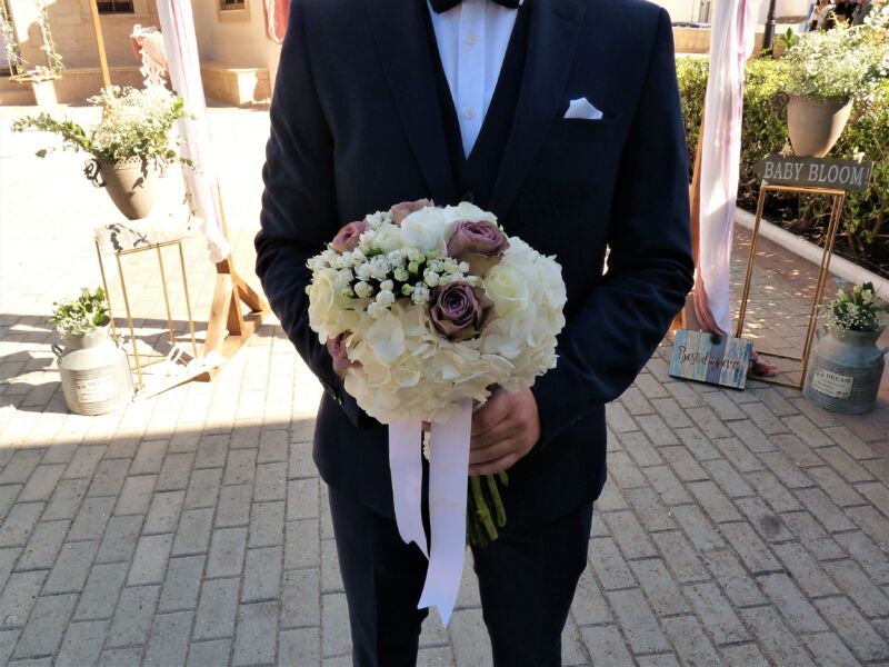 Για την νυφική ανθοδέσμη επέλεξαν λευκή Ορτανσία, μπουβάρδια, τριαντάφυλλα, λευκά και σάπιο μήλο.