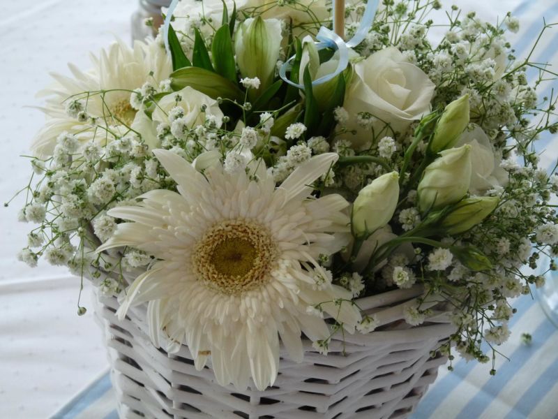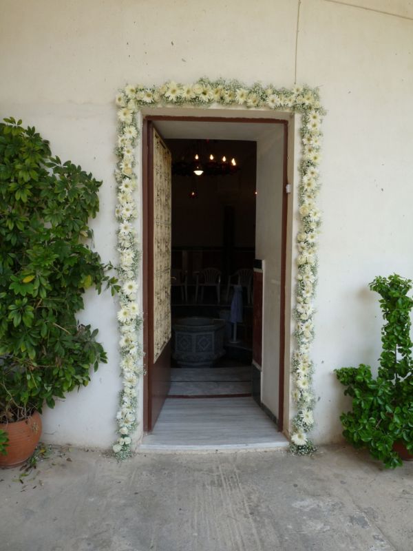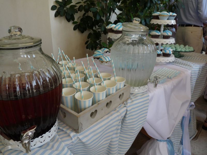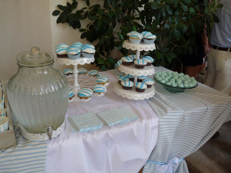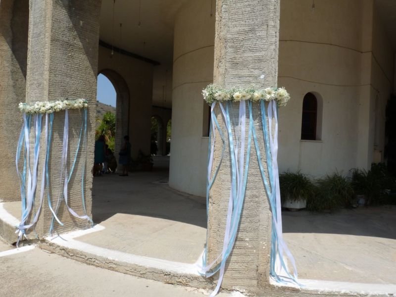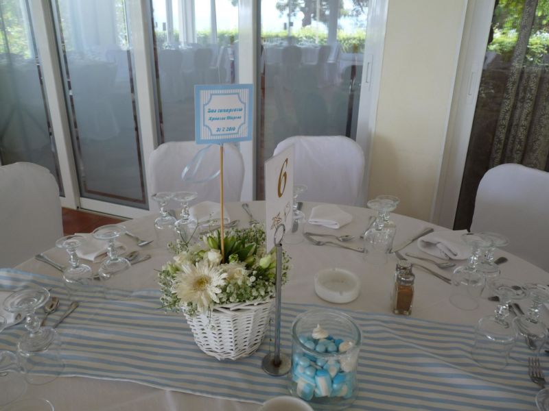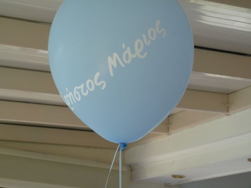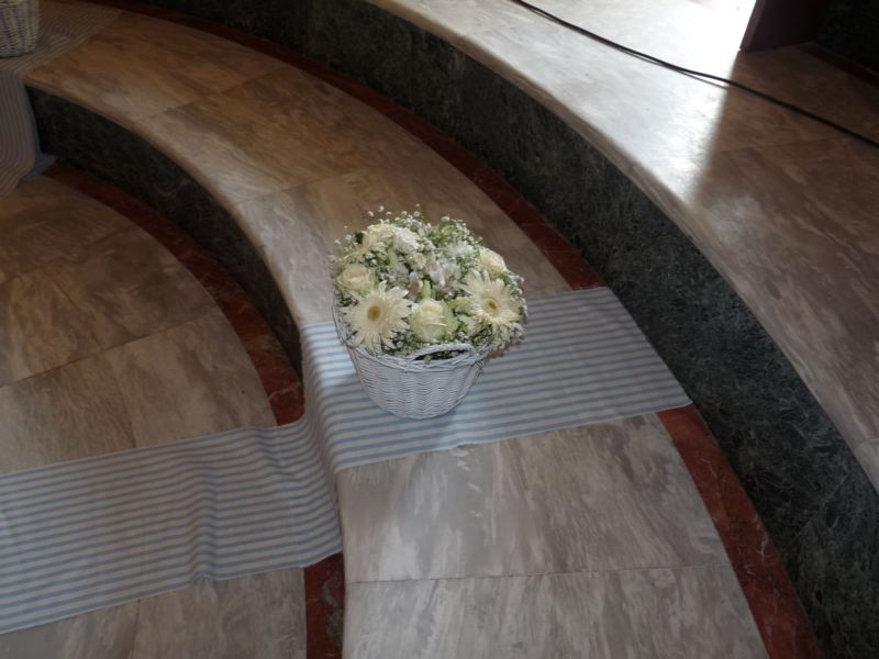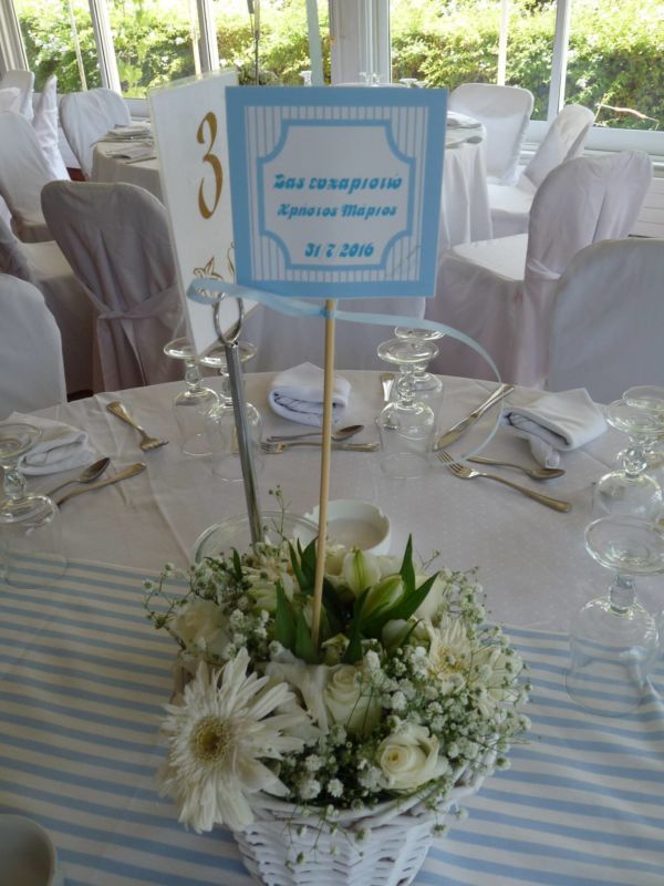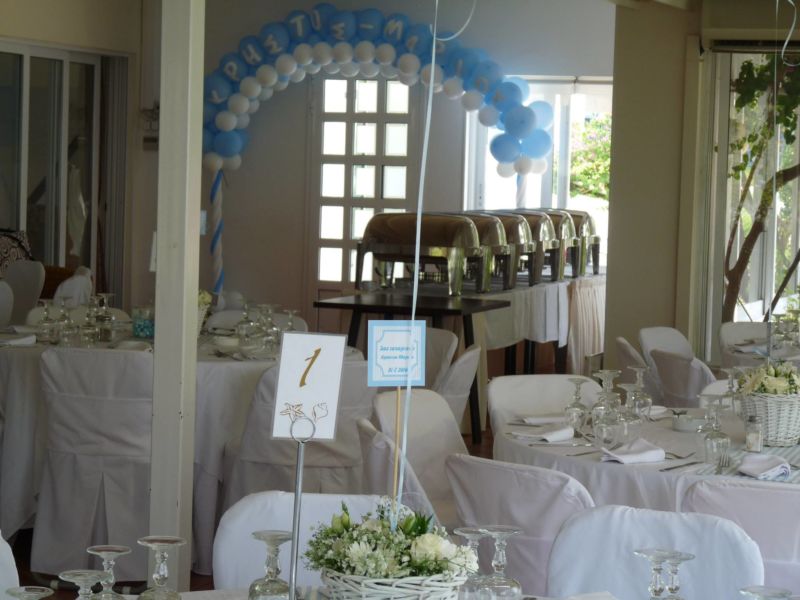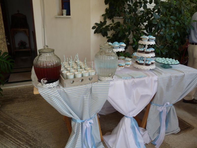 .. Μπαίνοντας στο εσωτερικό του Ναού,λευκά μπαμπού κοφίνια διακοσμούσαν τα ριγέ βαμβακερά υφασμάτινα ράνερ πάνω στα αμφιθεατρικά σκαλιά γύρω από την λευκή μαρμάρινη κολυμπήθρα!! Μετά την Βάπτιση ακολούθησε δεξίωση όπου είχαμε διακοσμήσει τον χώρο στο ίδιο ύφος αλλά και με πολλά μπαλόνια, με το όνομά του νεοφώτιστου!!