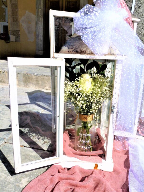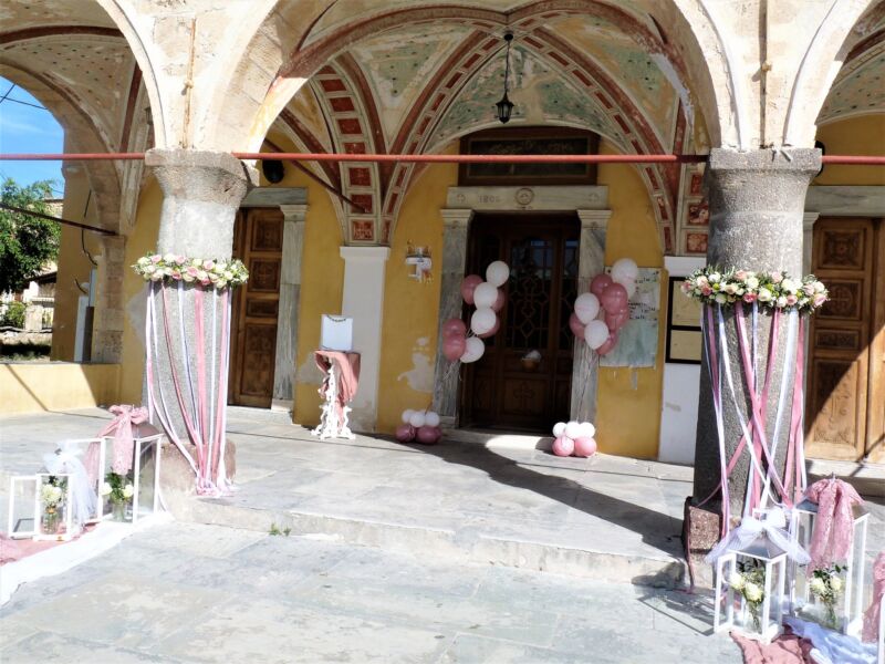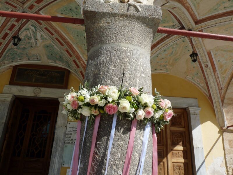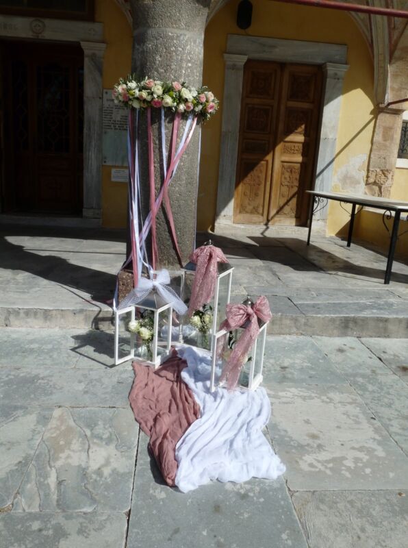 Στον εξωτερικό χώρο του Ναού δημιουργήσαμε συνθέσεις φαναριών με λουλούδια ενώ τις δύο μεγάλες κολώνες της εισόδου αγκάλιαζαν πλούσια ολάνθιστα στεφάνια από τριαντάφυλλα, φρέζιες και φύλλα ελιάς, δημιουργώντας το πιο όμορφο σκηνικό!!!