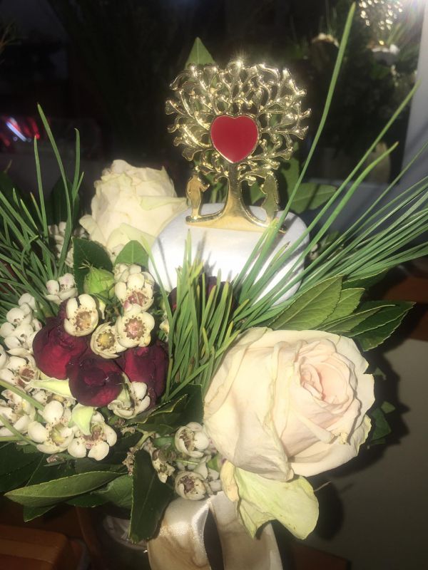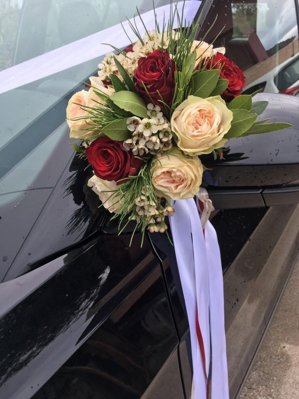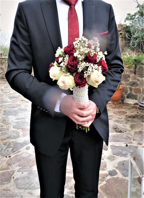 Η νυφική ανθοδέσμη σκούρα κόκκινα σε συνδυασμό με υπόλευκα τριαντάφυλλα με μπλεγμένο wax ανάμεσά τους που ξεπρόβαλε και την έκανε τόσο ξεχωριστή και φινετσάτη!