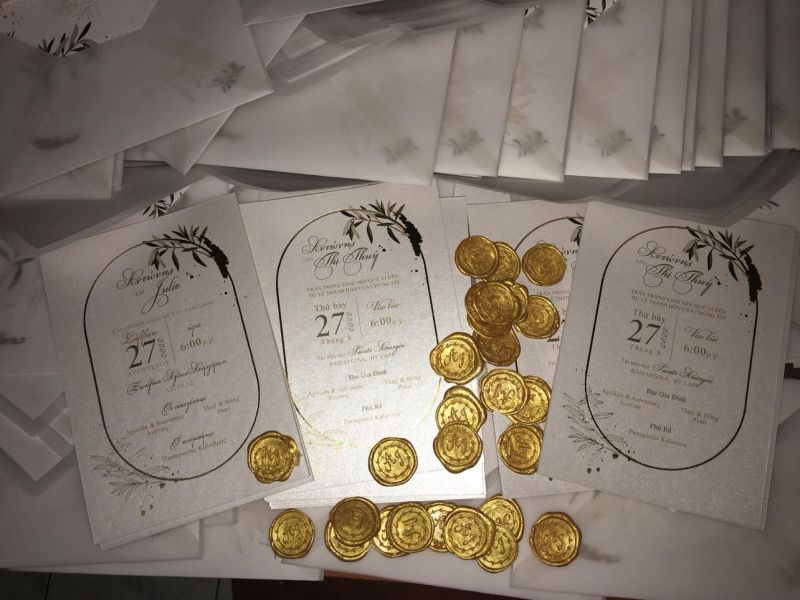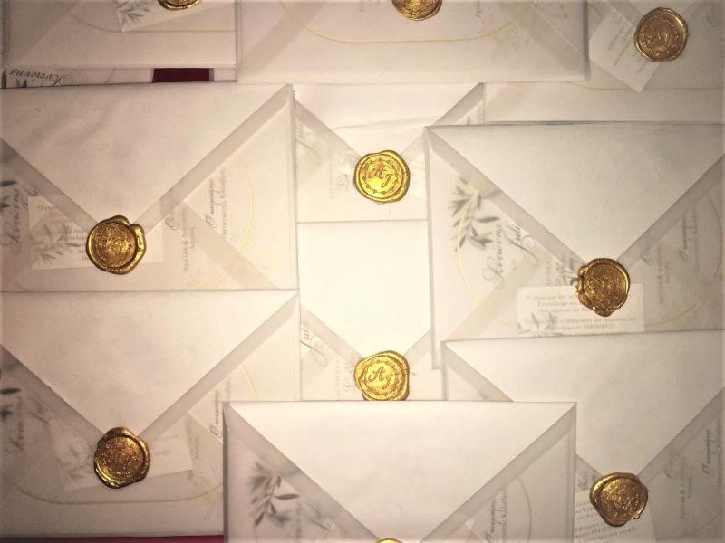 Το προσκλητήριο υπέροχο, στο χρώμα της άμμου με φύλλα ελιάς και λεπτομέρειες χρυσοτυπίας εκτυπωμένο σε καρτολίνα μελαμινέ μέσα σε έναν αριστοκρατικό φάκελο από ρυζόχαρτο σφραγισμένο με χρυσό βουλοκέρι με τα αρχικά τους!