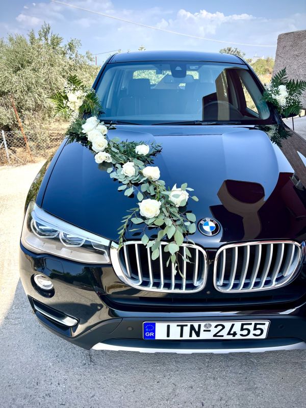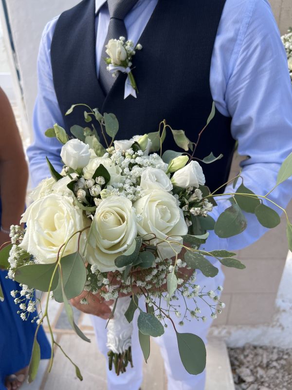 Τα λουλούδια που επέλεξε για την νυφική ανθοδέσμη της και γενικά για τον στολισμό, κυρίως λευκά τριαντάφυλλα, baby’s breath και φύλλα ελιάς.